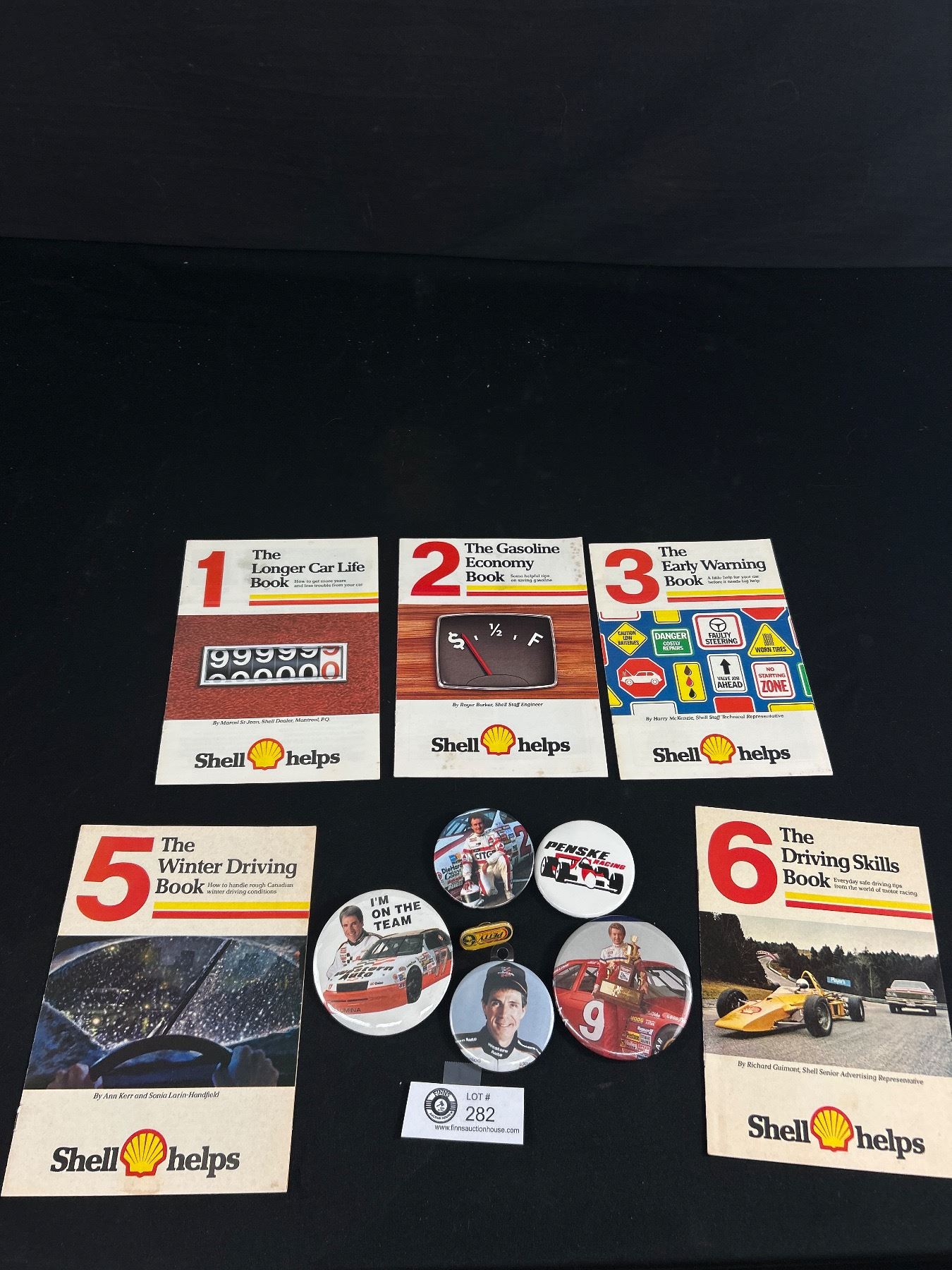 5 1970'd Shell Oil Pamphlets Plus a Lot of Car Racing Pins & Badges