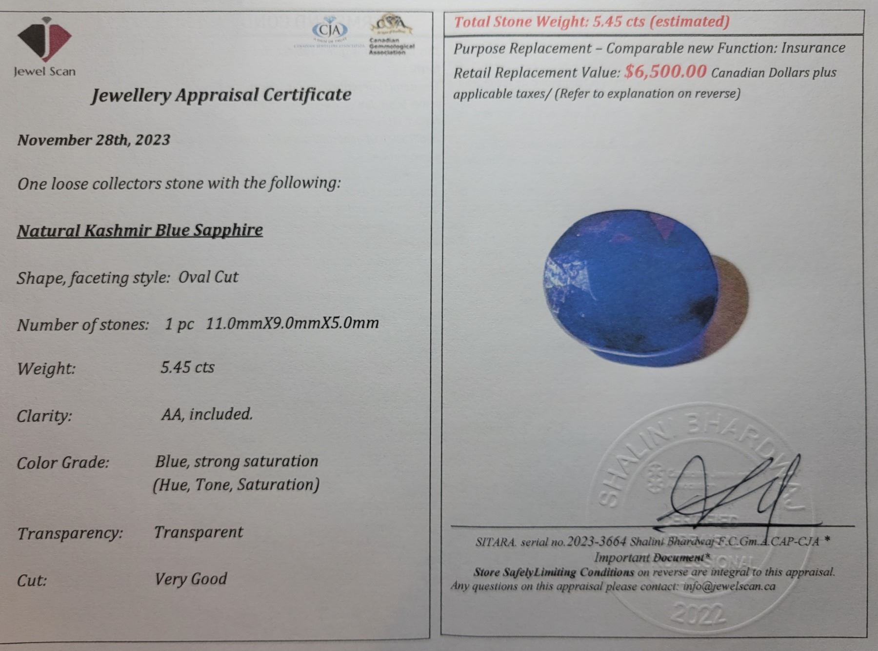5.45 CT CERTIFIED BLUE SAPPHIRE GEMSTONE ($6,500 APPRAISAL)