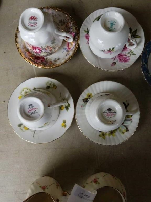 5 ANTIQUE CHINA CUPS AND SAUCERS AND CREAM AND SUGAR