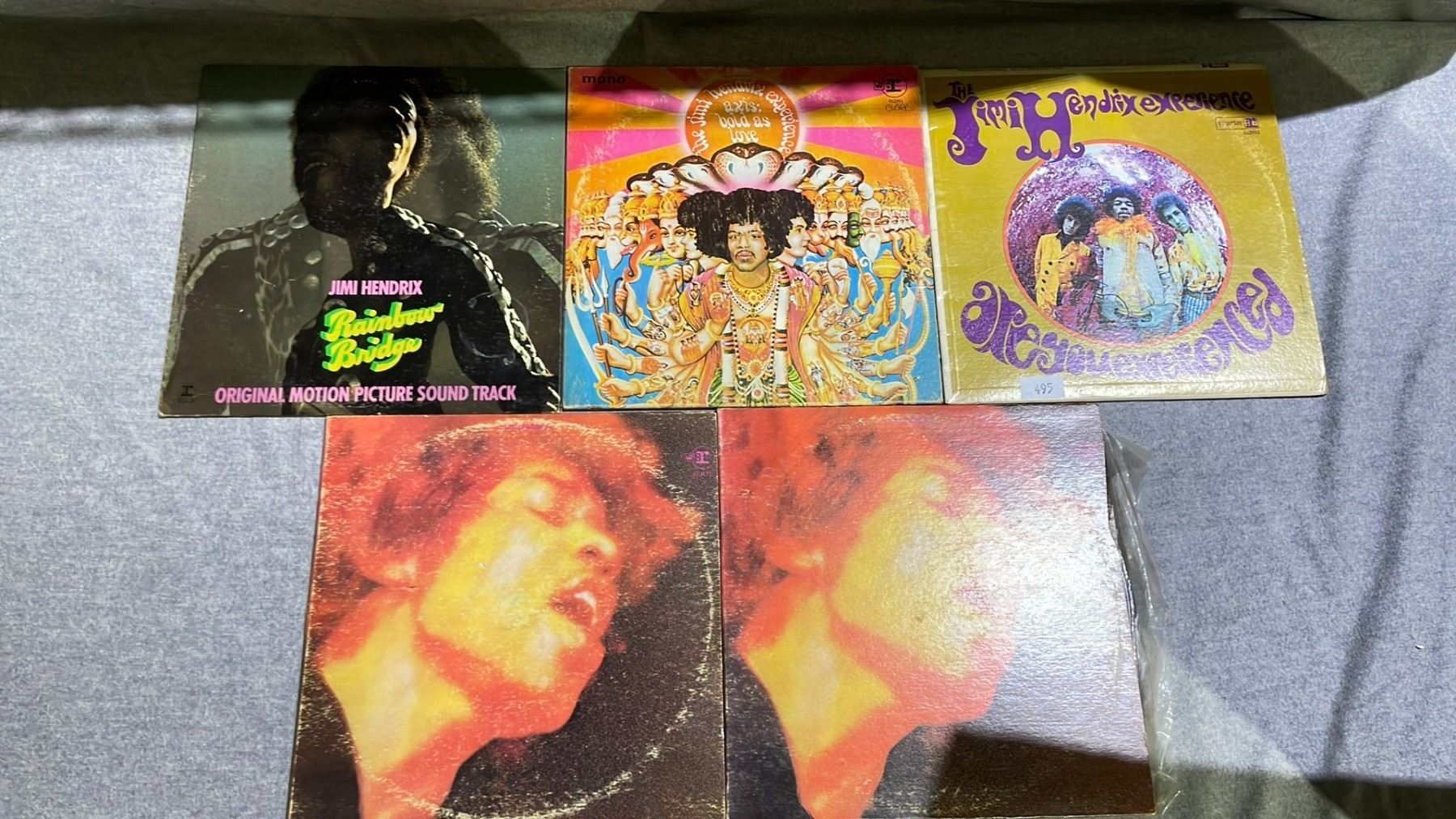 5 ASSORTED JIMI HENDRIX VINYL RECORDS INCLUDING; ARE YOU EXPERIENCED, AXIS: BOLD AS LOVE, RAINBOW BRIDGE & ELECTRIC LADYLAND
