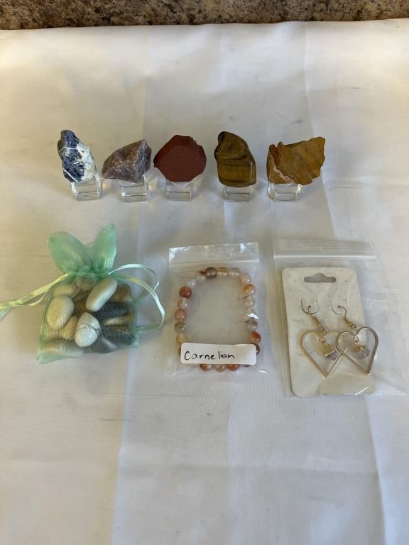 5 ASSORTED SEMI PRECIOUS STONES WITH MOKITE MIX TUMBLED STONES, CRYSTAL EARRINGS AND CARNELIAN BRACELET