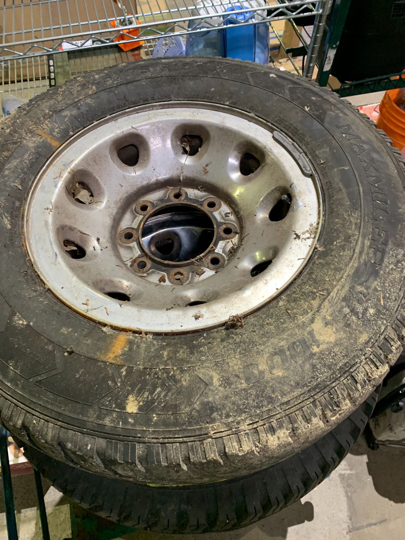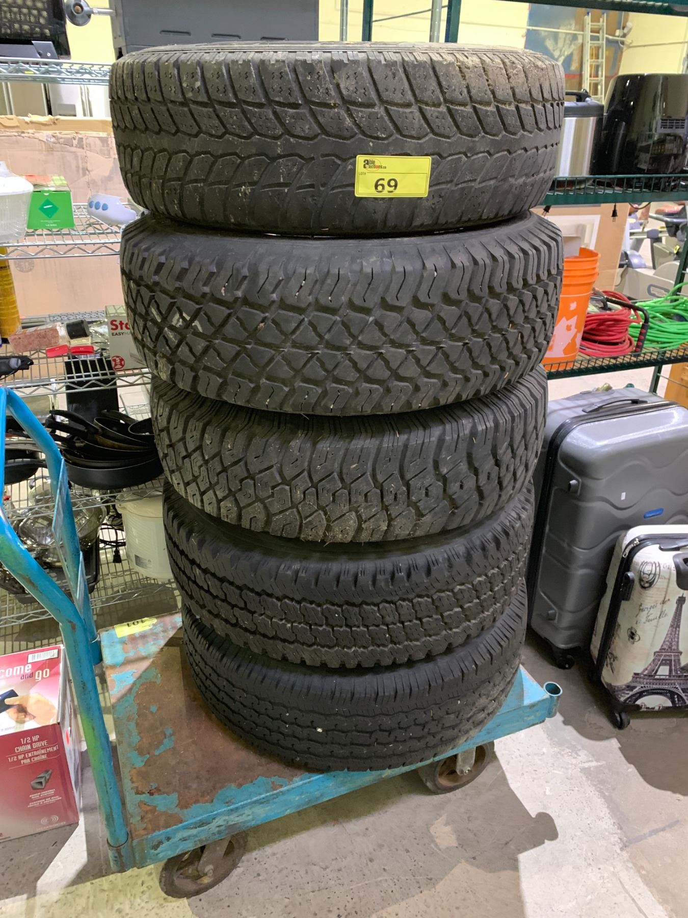 5 ASSORTED TIRES MOUNTED ON 8 BOLT RIMS