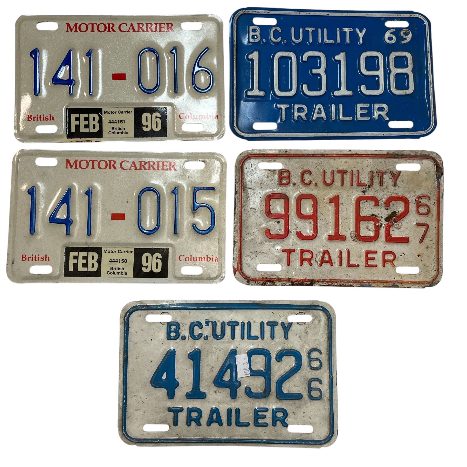 5 Assorted British Columbia License Plates: Motor Carrier & Utility 1960s & 90s