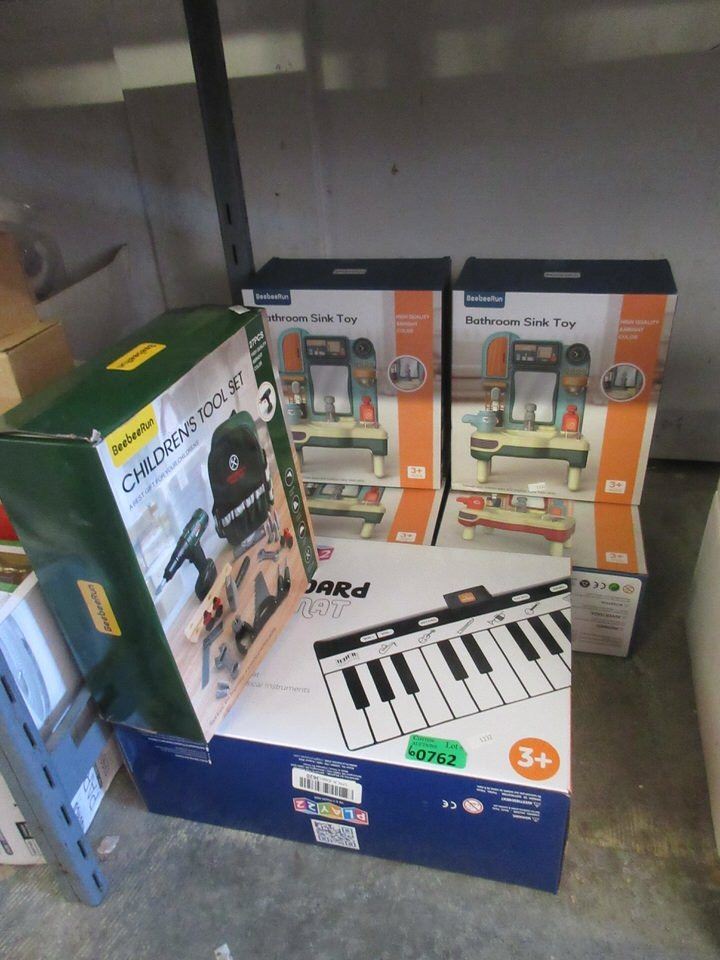 Keyboard playmat, tool set & 3 bathroom sink toy sets.