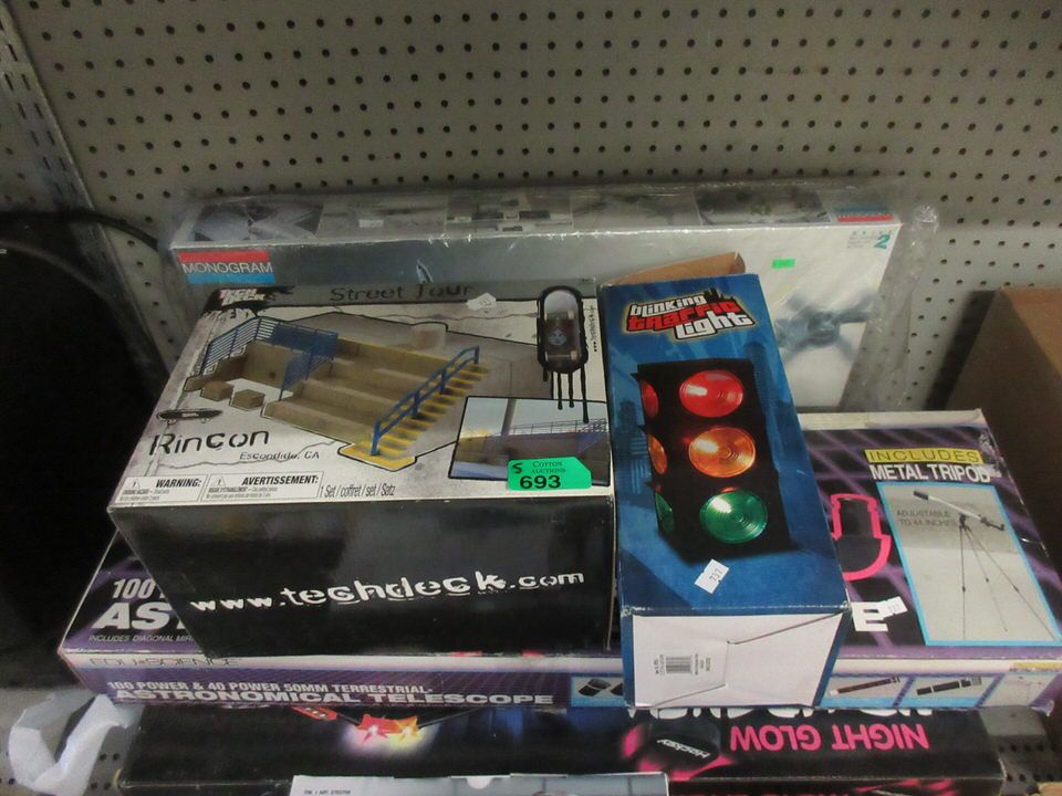 Blinking traffic light, telescope, Tech Deck Street Tour, Night Glow Air Hockey & B-29 Superfortress 1:48 scale model kit
