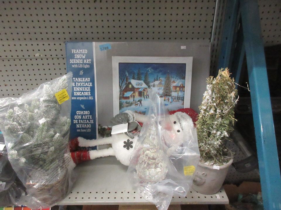 Snowman with weighted feet (one leg broken), 2 mini flocked trees, lighted glitter tree & framed snow scenic art with LED lights.