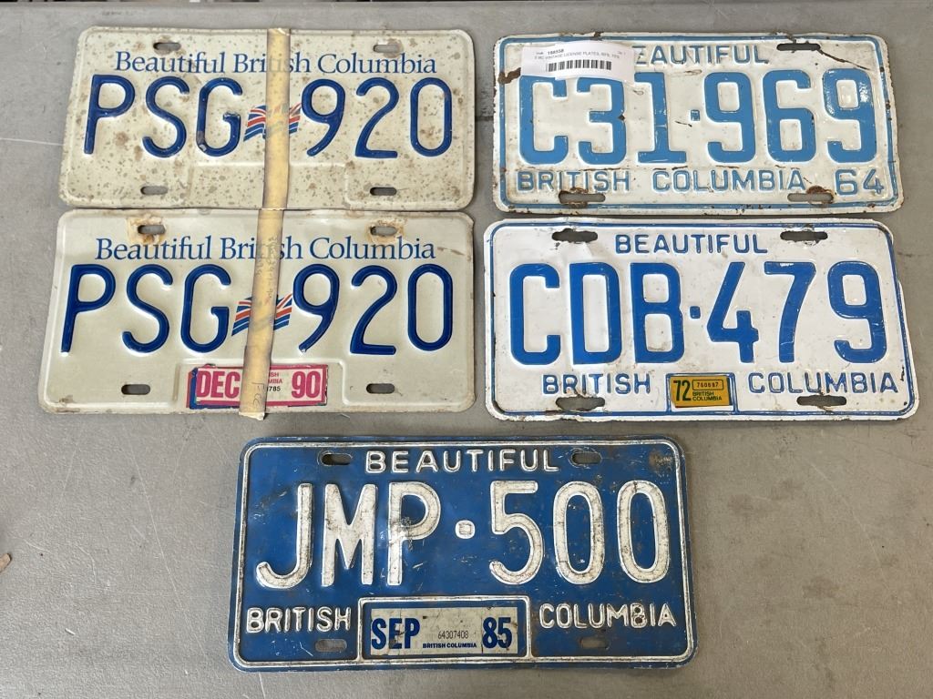 5 BC VINTAGE LICENSE PLATES, 60'S, 70'S, 80'S, ONE IS A PAIR