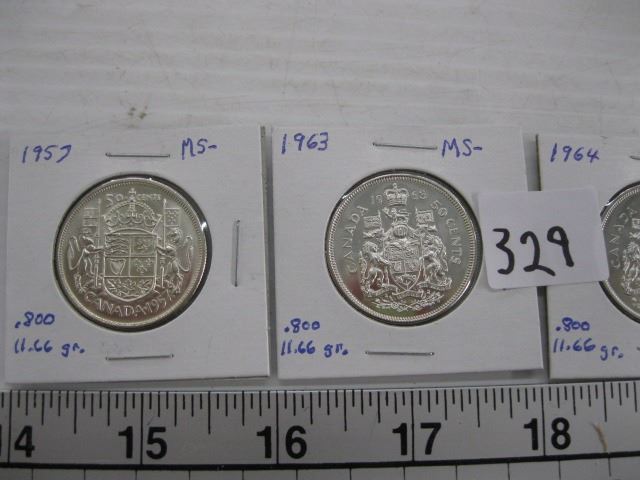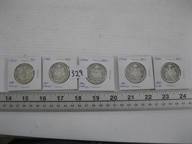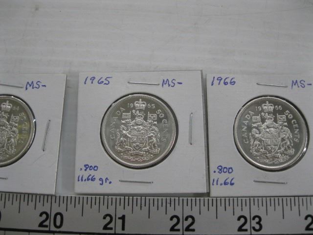 5 CANADIAN 50 CENT COINS, '57, '63, '64, '65 & '66