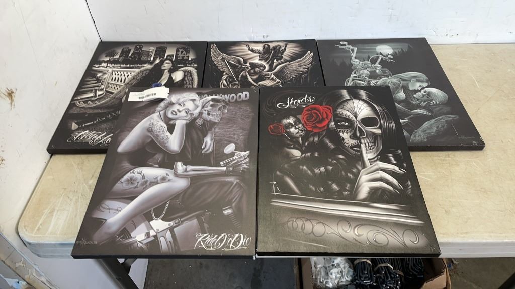 5 CANVAS PRINTS - MOTORCYCLE, TATTOO AND ANGEL