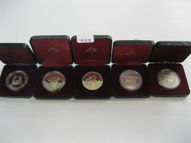 5 CASED CDN $1 COINS - 1-1988, 2-1982, 2-1985 - 50% SILVER