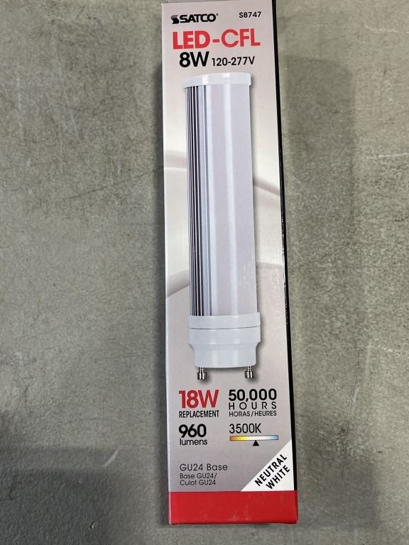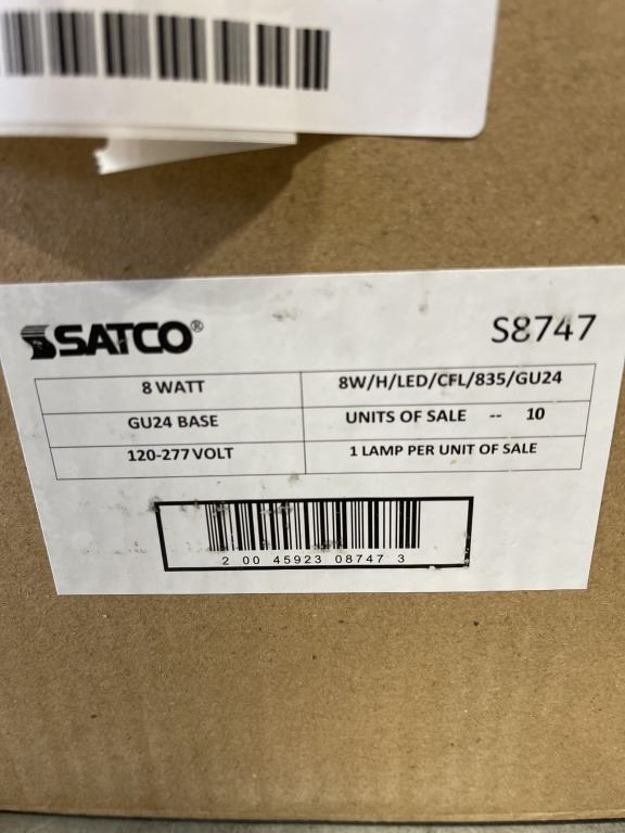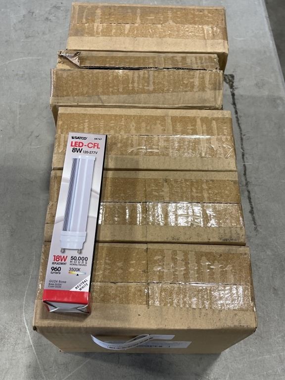 5 CASES OF NEW LED-CFL 8 WATT BULBS, GU24 BASE, 10 PER CASE, APPROX 50 TOTAL