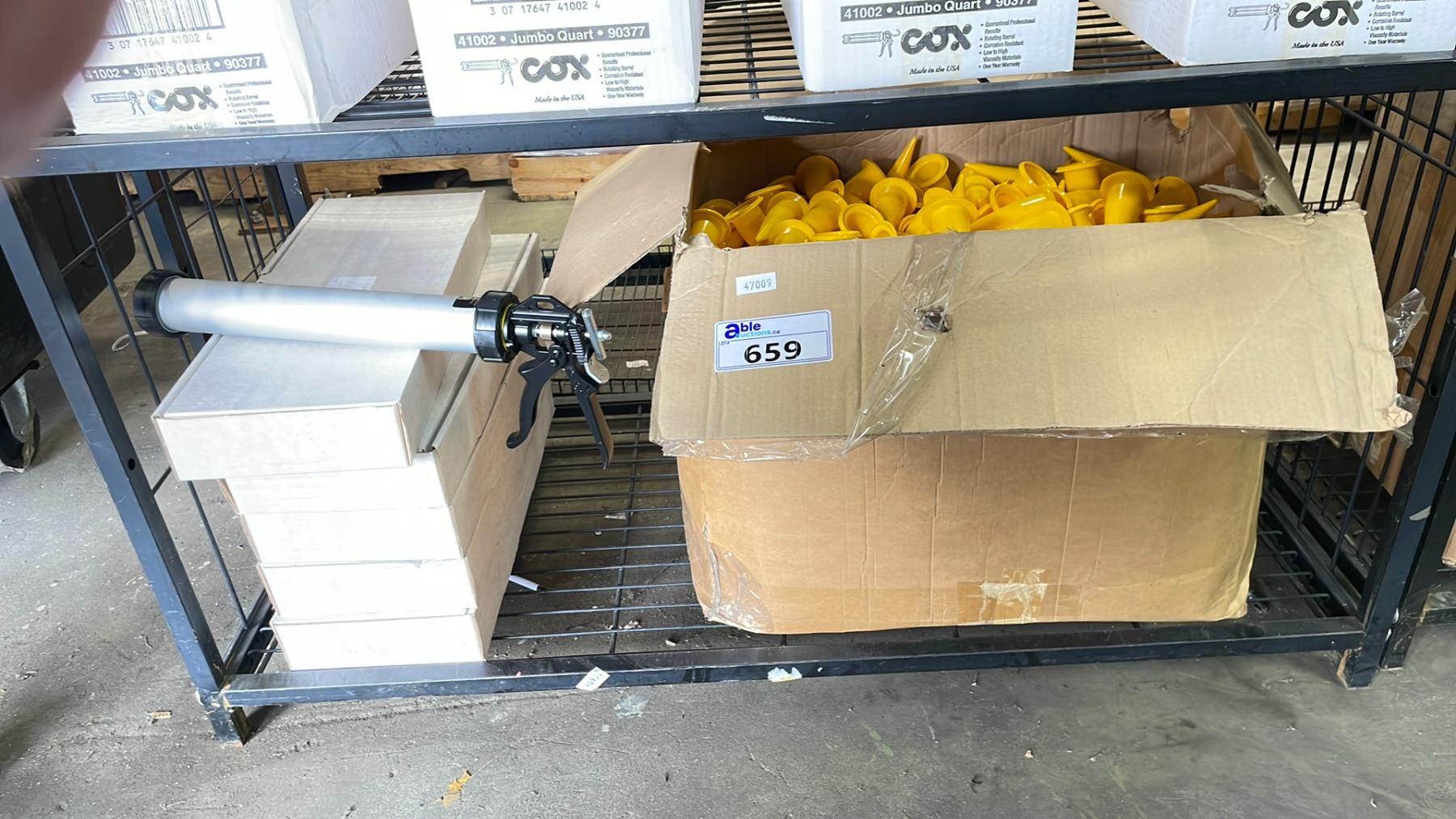 (5) COX AVON 600 CAULKING GUNS AND LARGE CASE OF YELLOW 2N1006 CONE NOZZLES