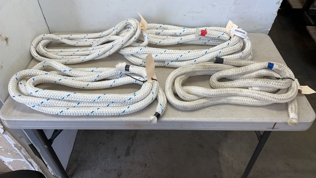5 LENGTHS OF ROPE - 20 FOOT X 1 INCH, 15 FOOT X 1 INCH, 16 FOOT X 3/4 INCH, 8 FOOT X 1 INCH AND 6 FO