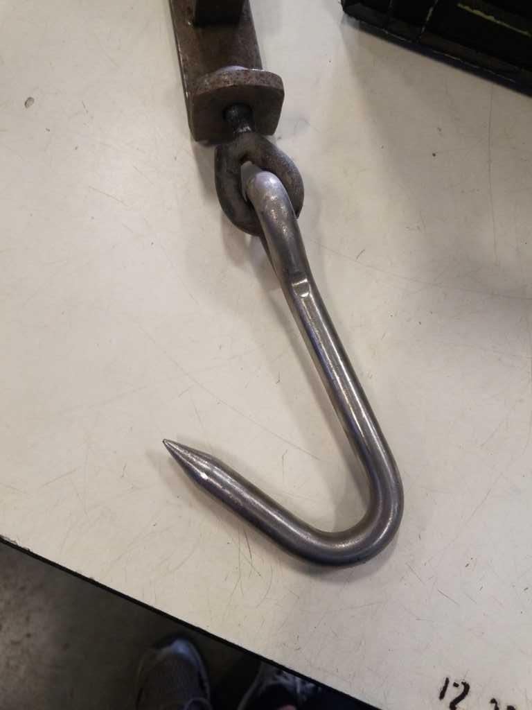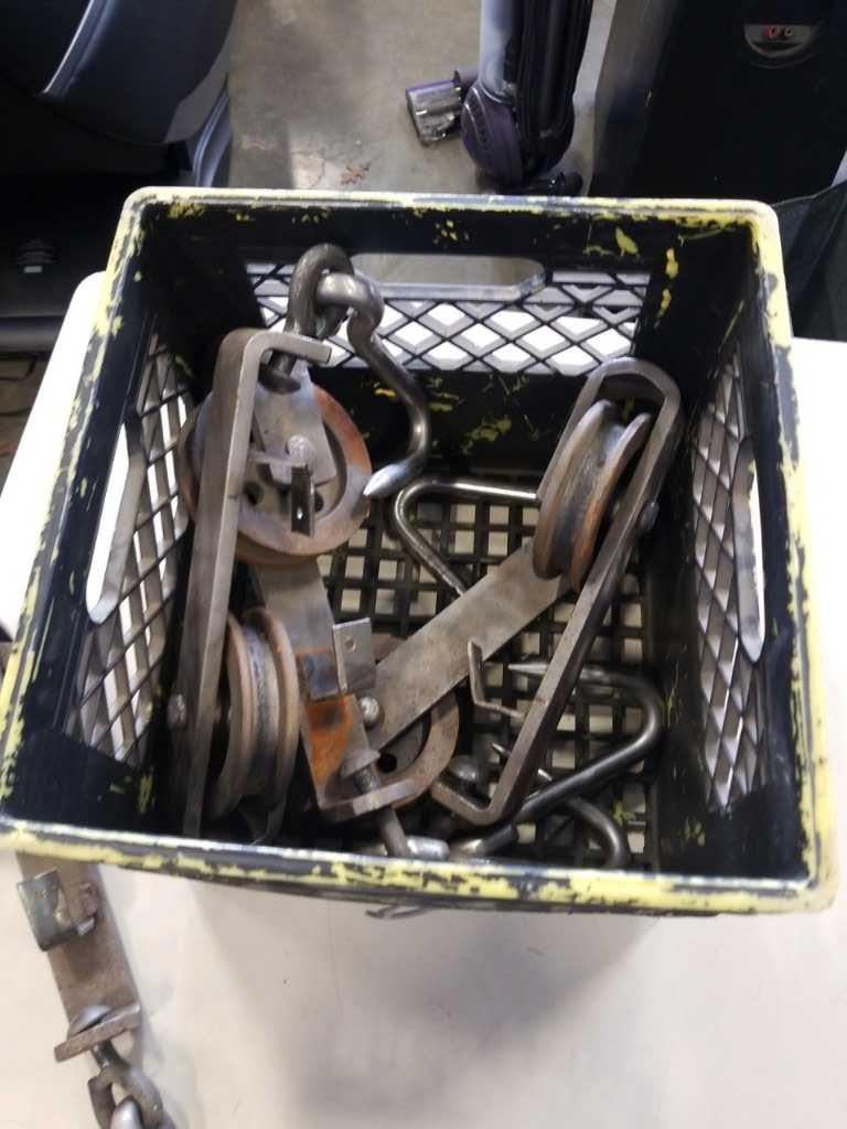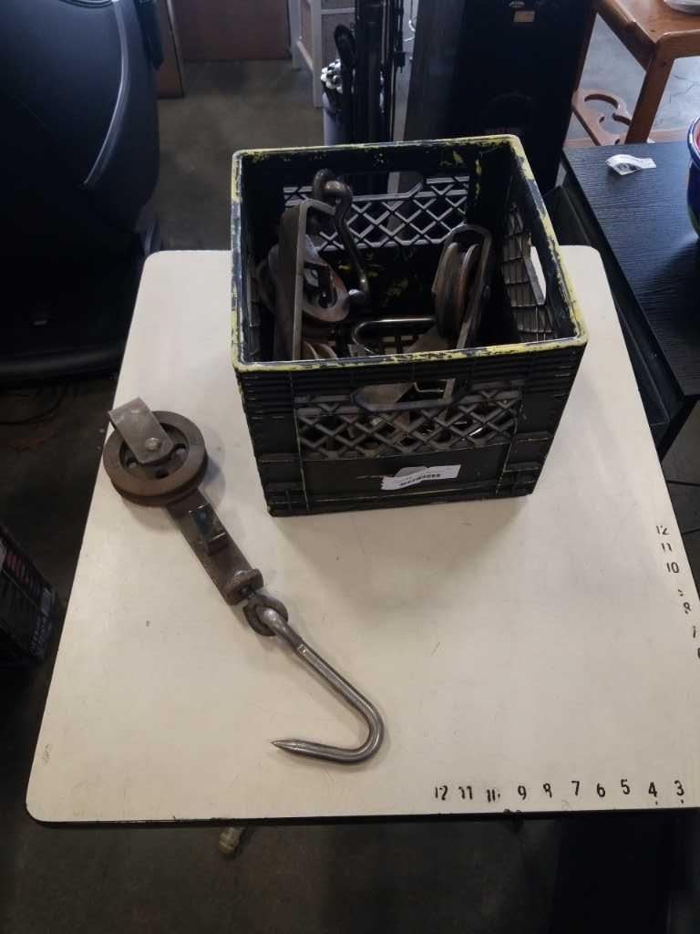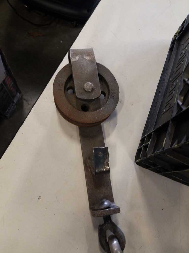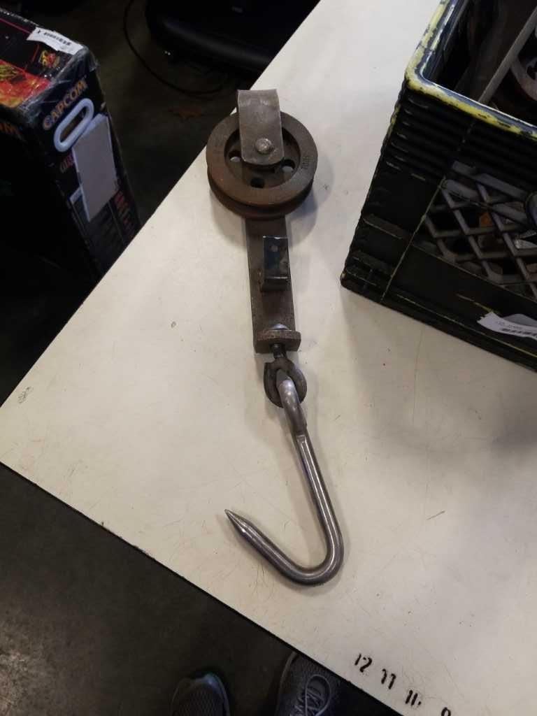 5 MOUND TOOL CO 5 INCH IRON PULLEY AND MEAT HOOKS - BEEF TROLLEY