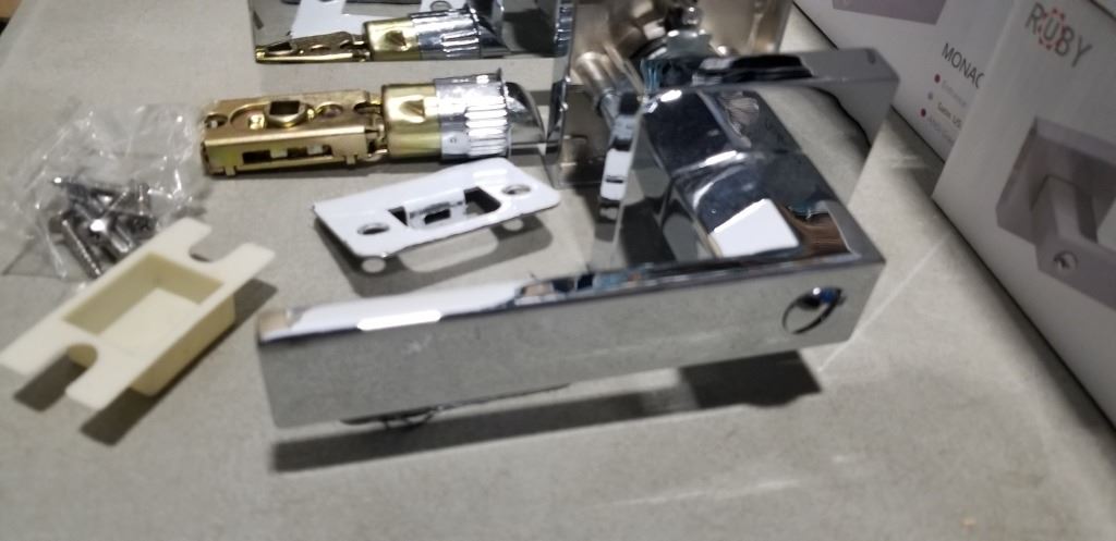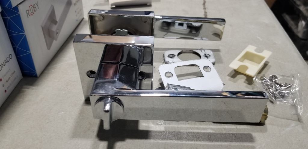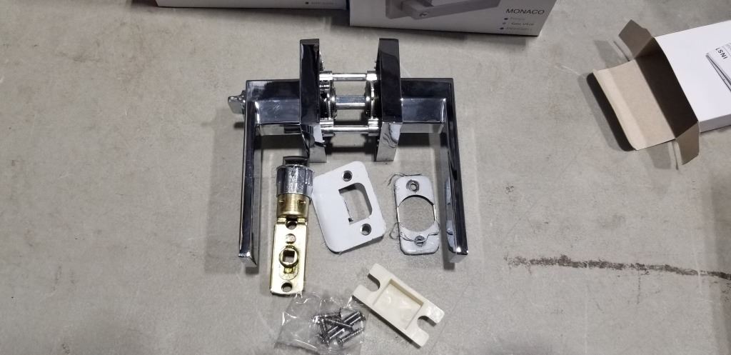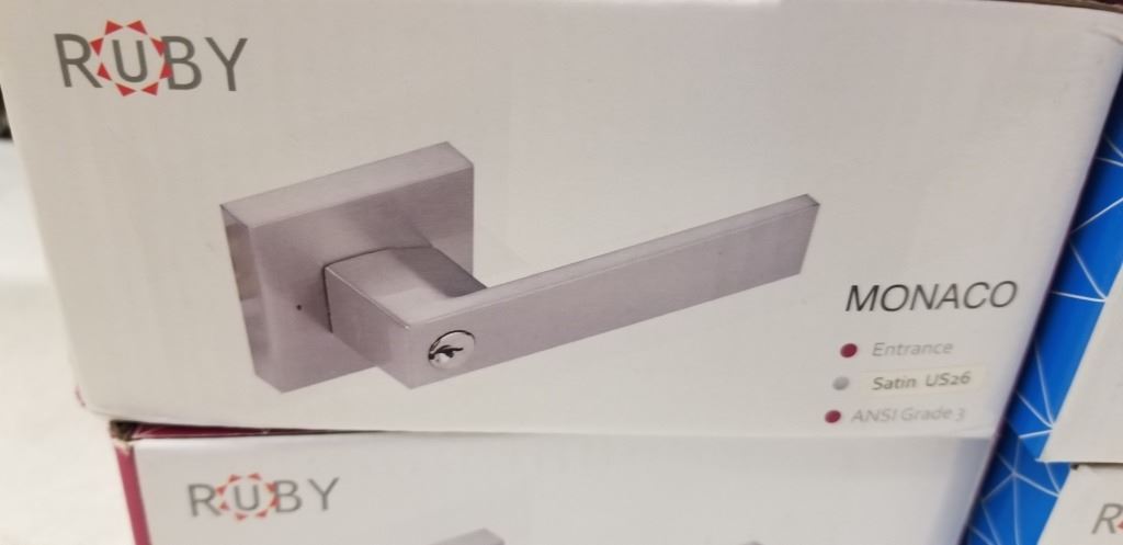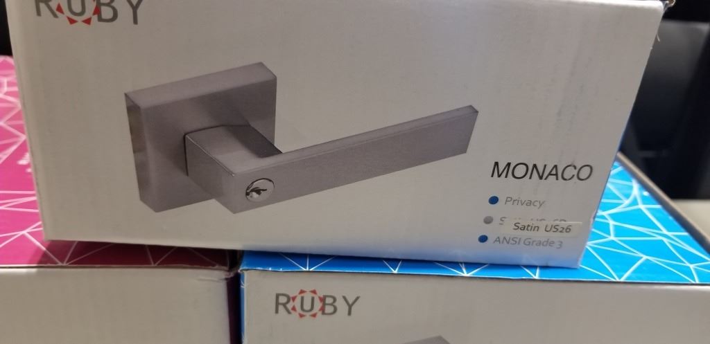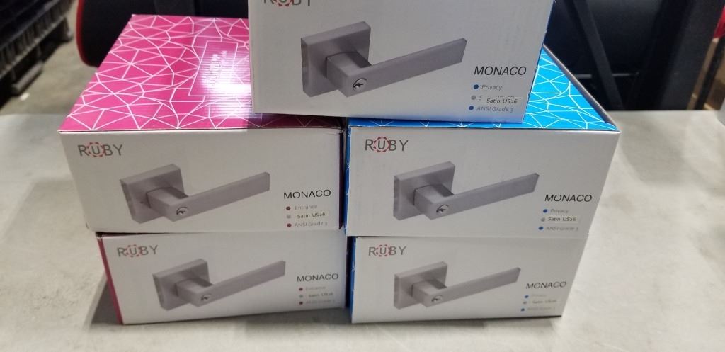 5 NEW MONACO DOOR LOCKS, US26 SATIN FINISH, ANSI GRADE 3, 3 PRIVACY AND 2 ENTRANCE