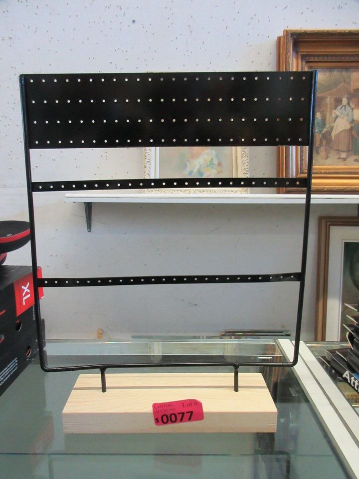 Holds up to 44 pairs of earrings. Wood base and metal rack. 27 cm x 35 cm.