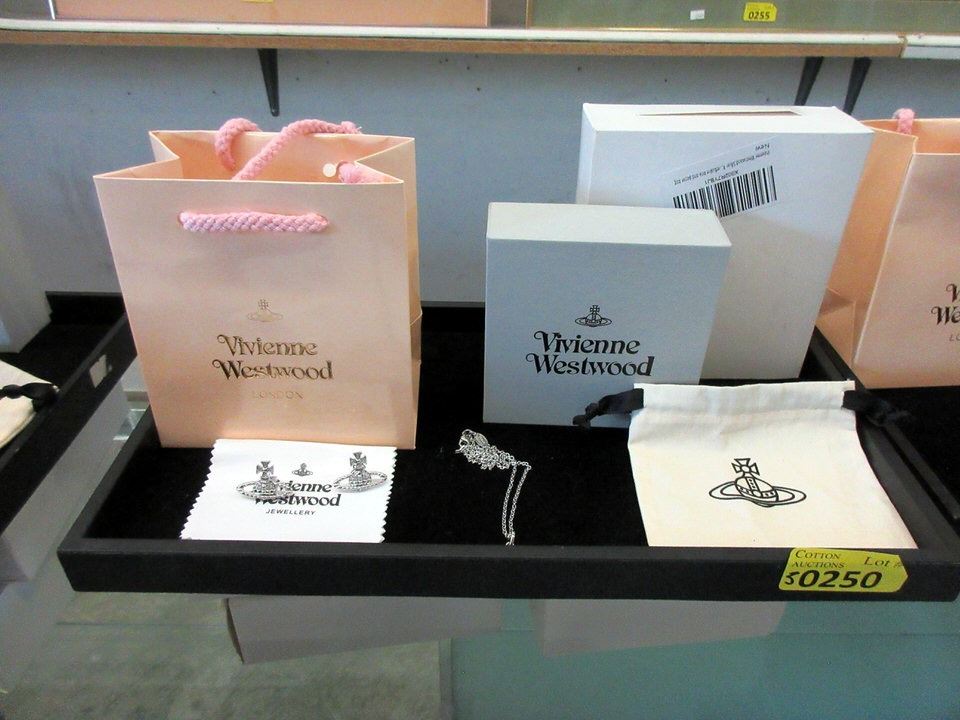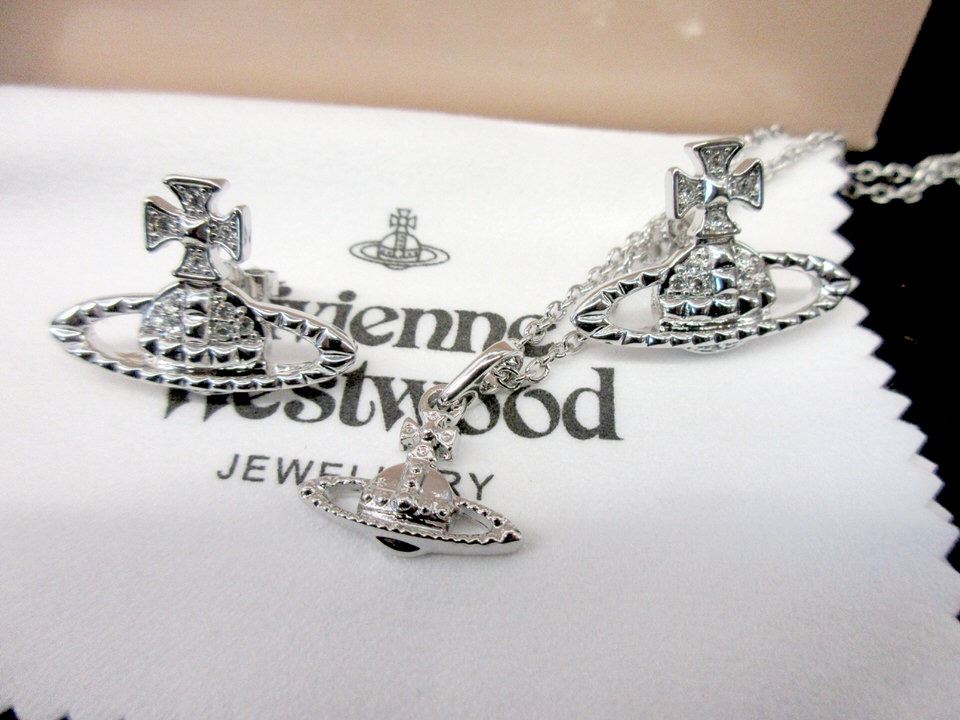 2 Silver tone necklaces and 3 pairs of post back earrings. Includes cloth bags, boxes, and gift bags. Not authenticated.