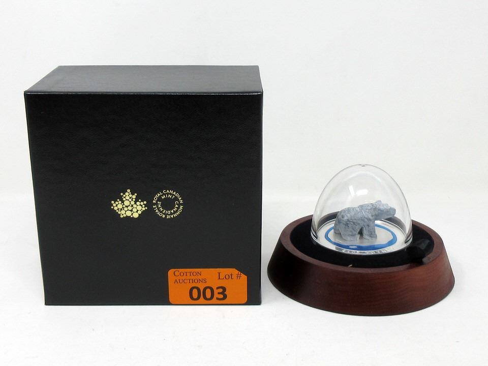 157.6 Gram .9999 Fine Silver $50 coin, with carved Soapstone Polar Bear. Mintage:1,300. Original mint box and certificate.