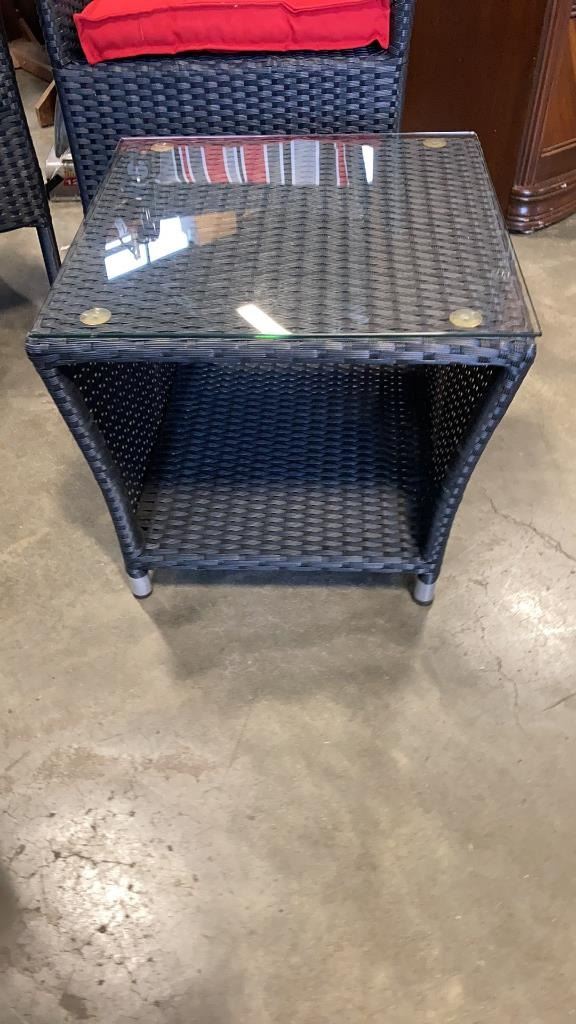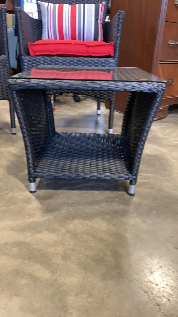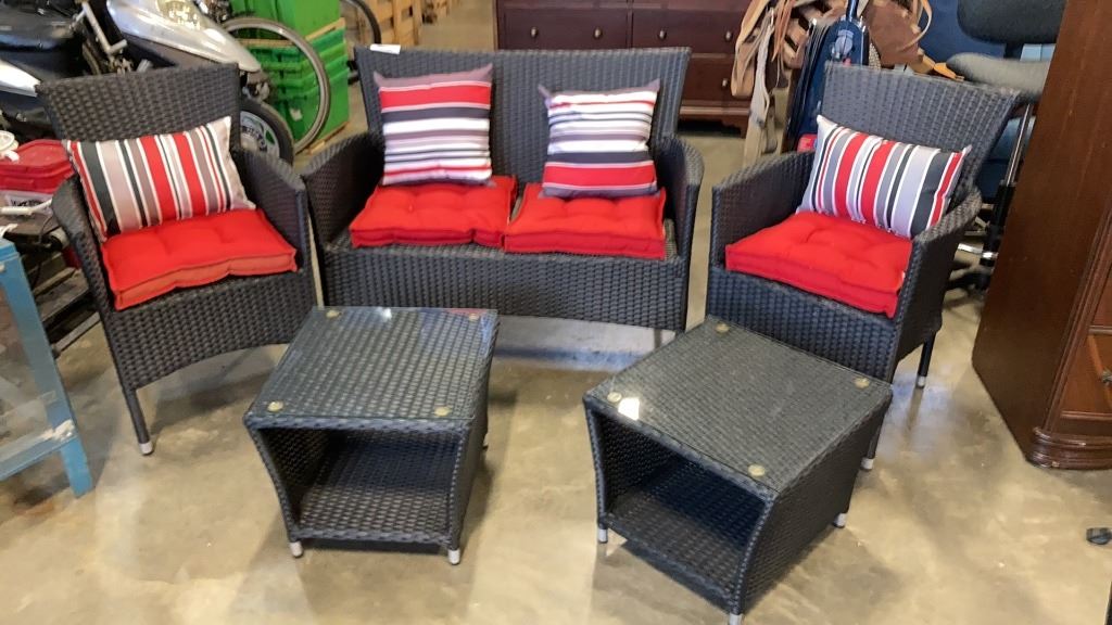5 PIECE WICKER PATIO SET WITH LOVESEAT, 2 CHAIRS AND 2 GLASSTOP ENDTABLES