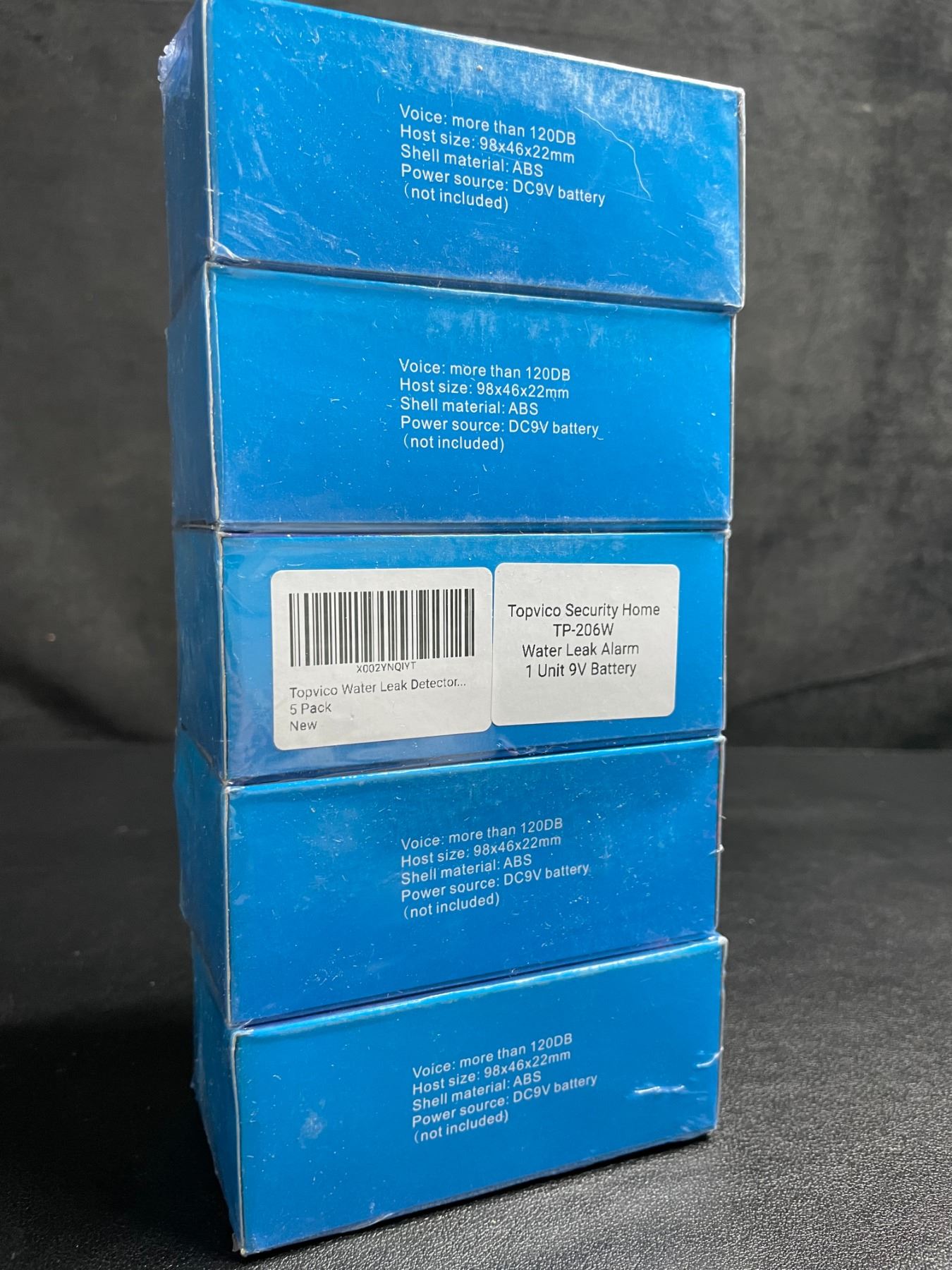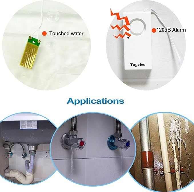 - topvico water leak detector, 120db loud siren, powered by 9v battery (not include), sensor alarm for rv kitchen basement water heater, 5 pack