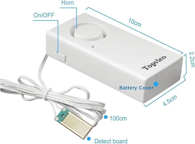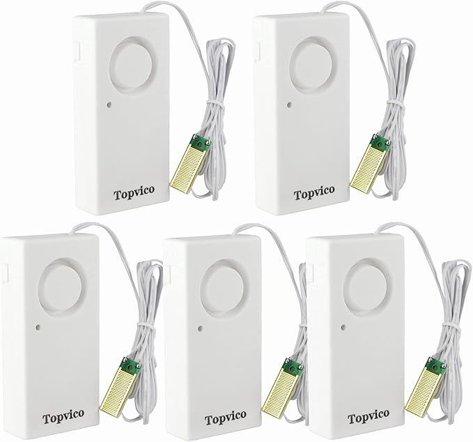 - topvico water leak detector, 120db loud siren, powered by 9v battery (not include), sensor alarm for rv kitchen basement water heater, 5 pack