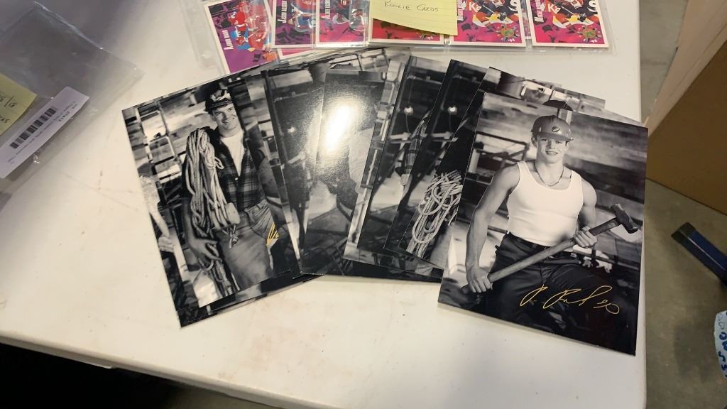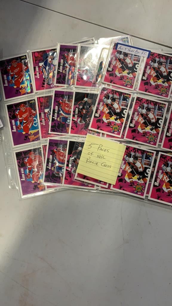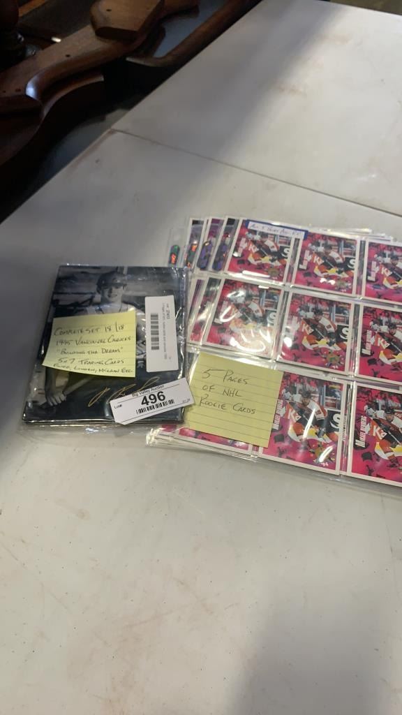 5 Pages of NHL rookie cards and canucks 1995 photo set