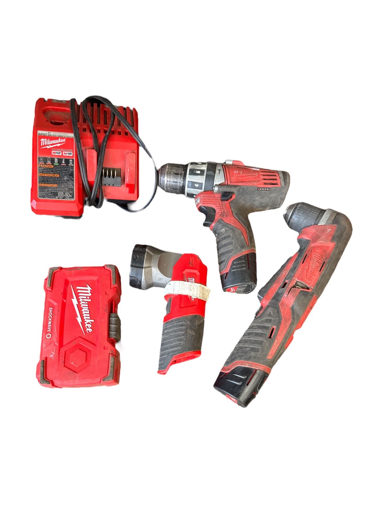 5 Pc - Milwaukee M12 90Degree Drill, Hammer Drill, Flashlight & Charger w/ Shockwave Case