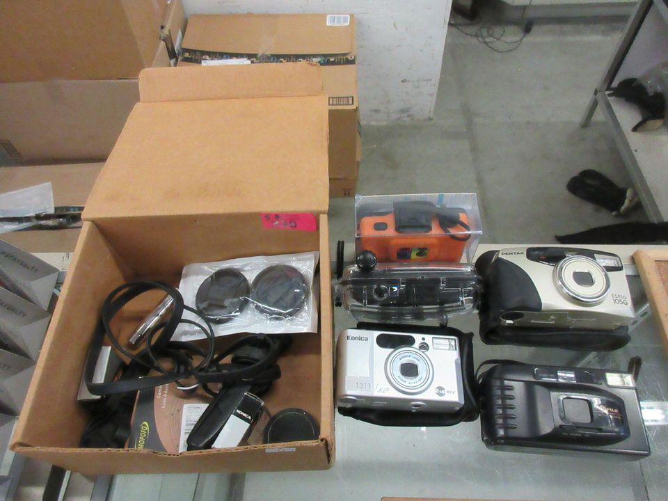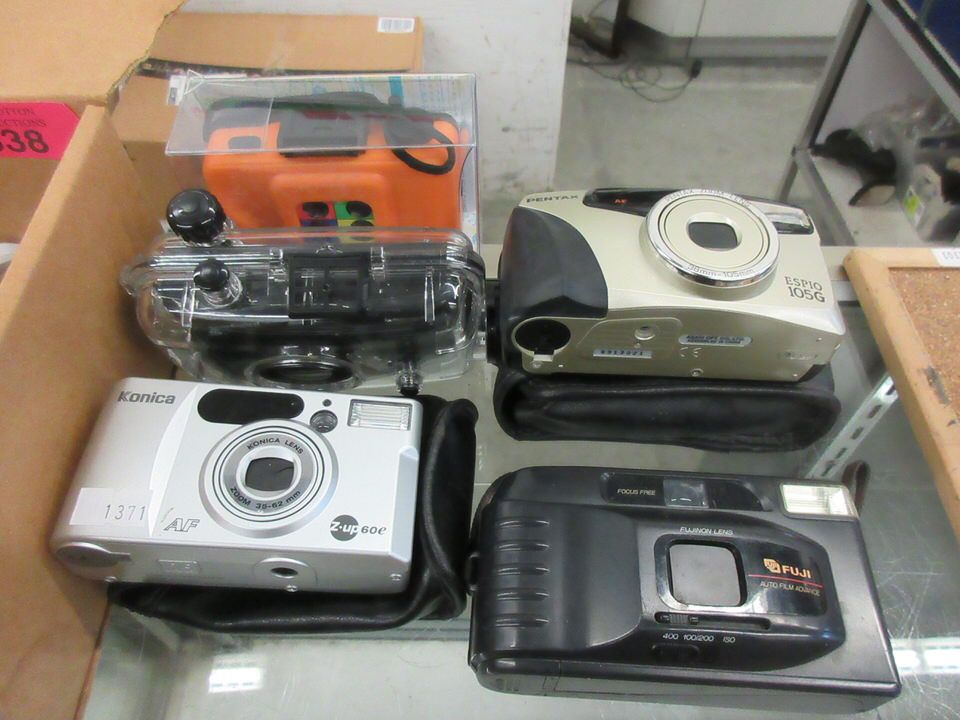 Fuji DL-15, Konica Z-up 60e, Pentax ESPIUO 105G with case, Snap Sights! in underwater case, Zol Action Freeze & box of accessories.