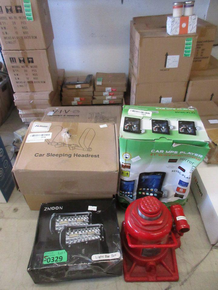 2 Car Sleeping Headrests, Light Bar Set, Bottle Jack, and Car MP5 Player.