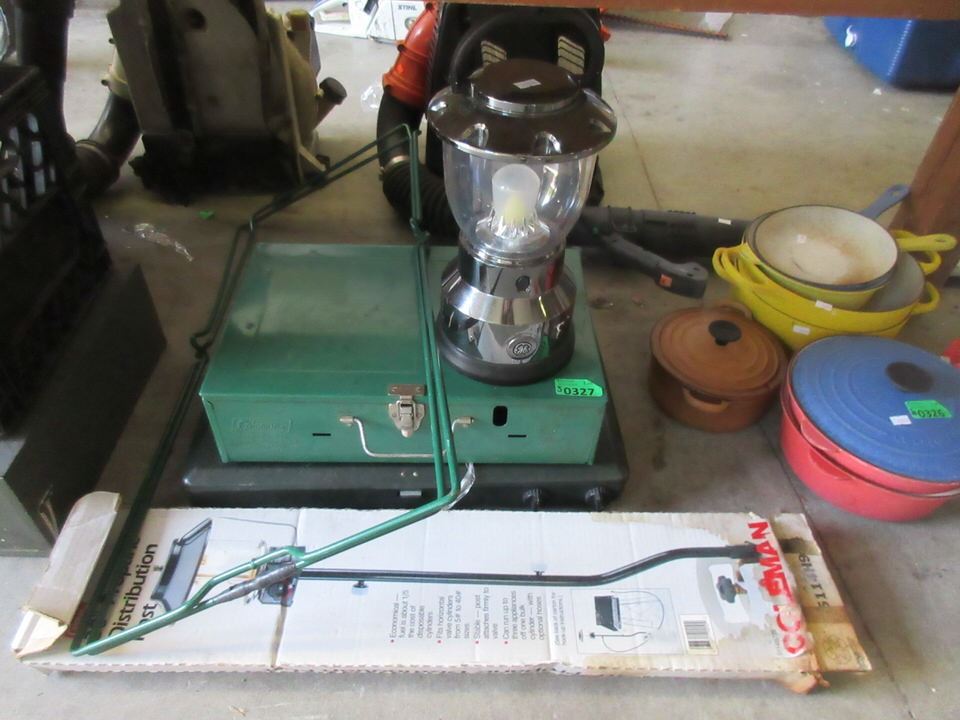 2 Camp stoves, bag stand, propane distribution post and lantern.