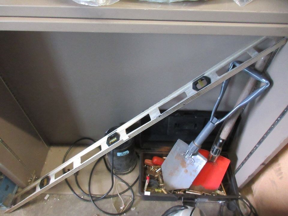 Sump pump, large level, box of hand tools, and 2 folding shovels.