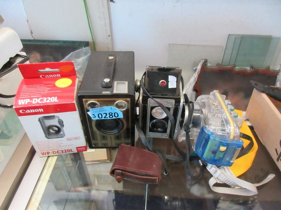 Canon Waterproof case, Kodak Duraflex, Kodak Brownie Junior, and light meter.