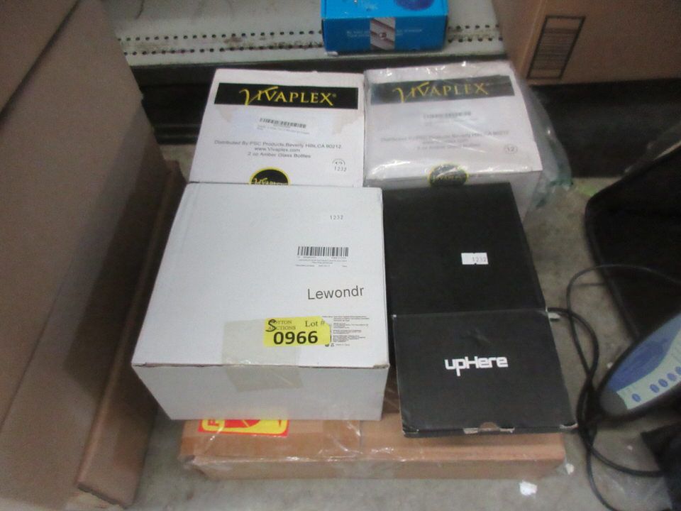 2 boxes of 2 oz. amber glass bottles, electronics fans, mini ceramic plant pots & box of gallery frames.