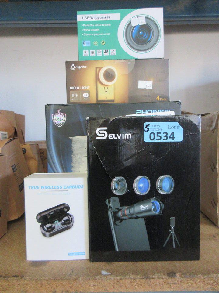Wireless Ear Buds, Cell Phone Camera Lens Kit, Night Light, Web Cam and Communications Headset.