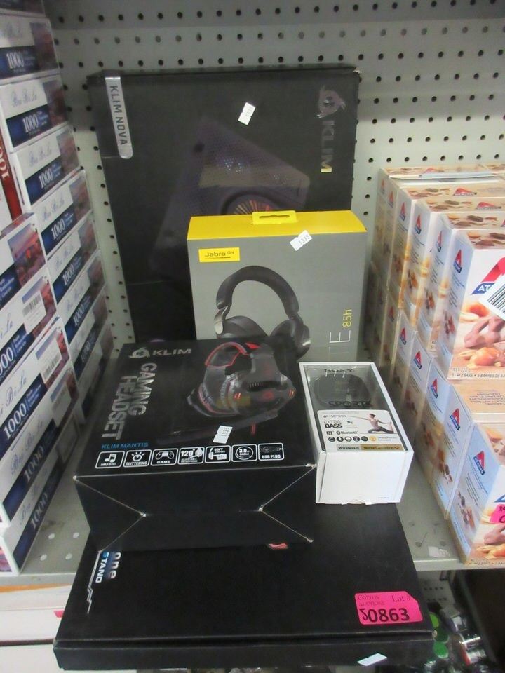 2 KLIM laptop coolers, gaming headset, Jabra Elite headphones, and Sony Sport Bluetooth headphones.