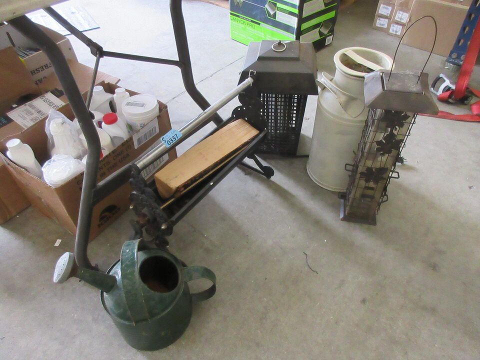Watering can, cream can, bug zapper, bird feeder and paper log roller.