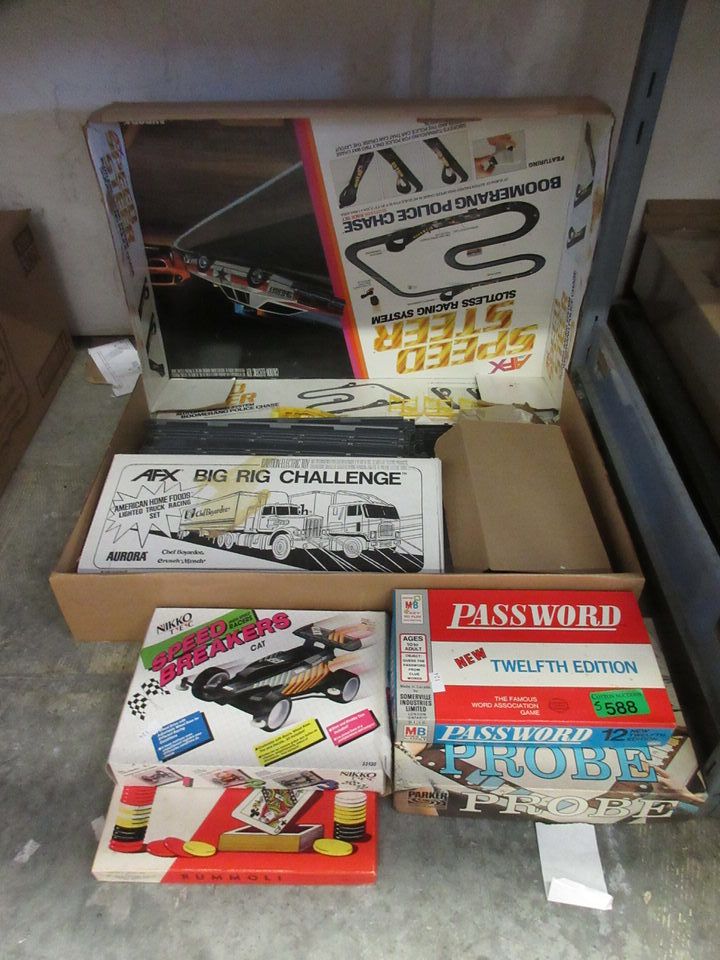 Aurora Speed Steer slotted race track with AFX Big Rig Challenge, Nikko Tech Speed Racers, Rummoli, Probe and Password.