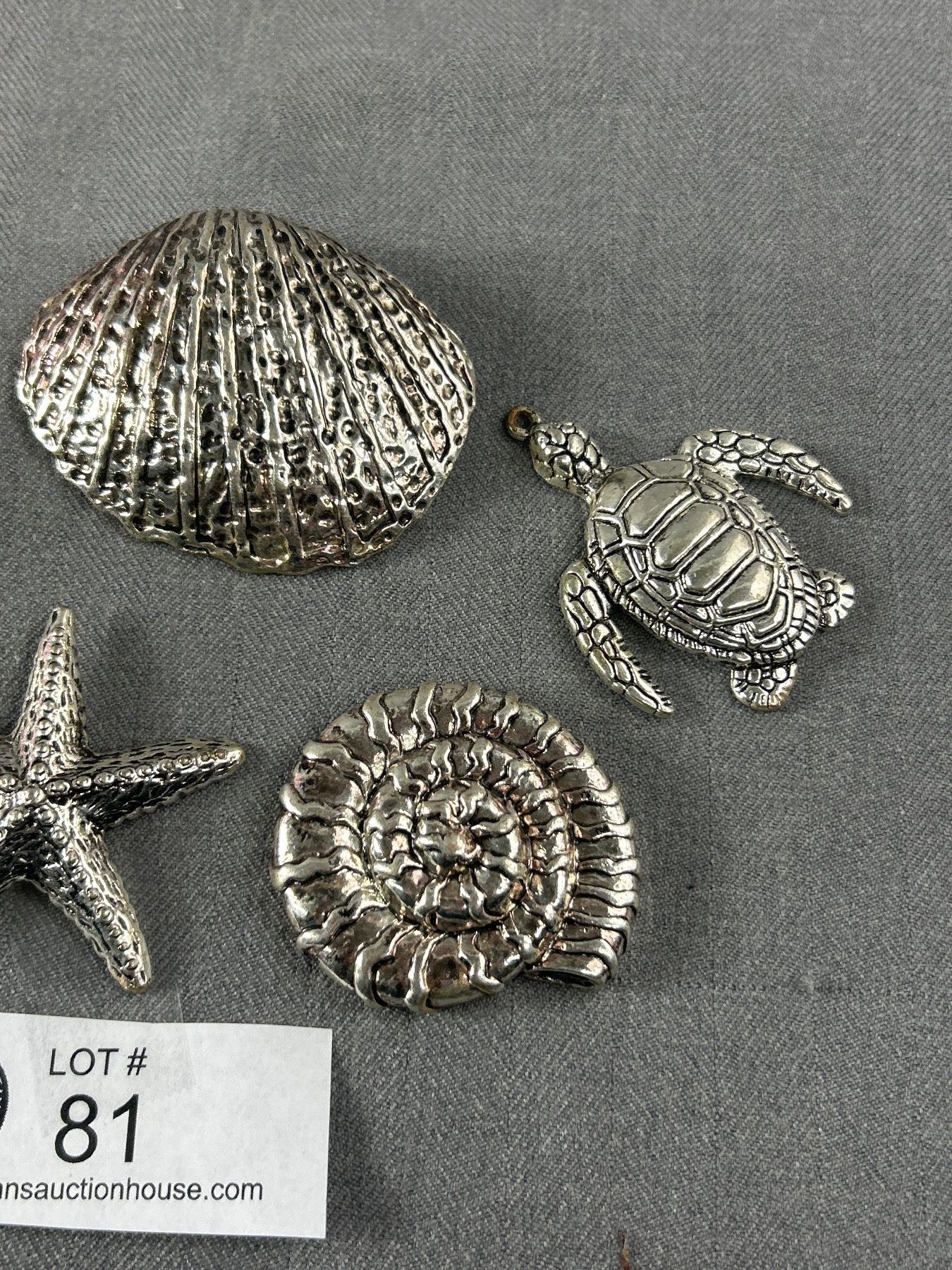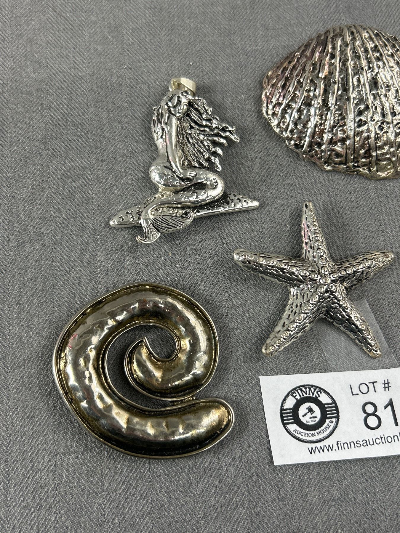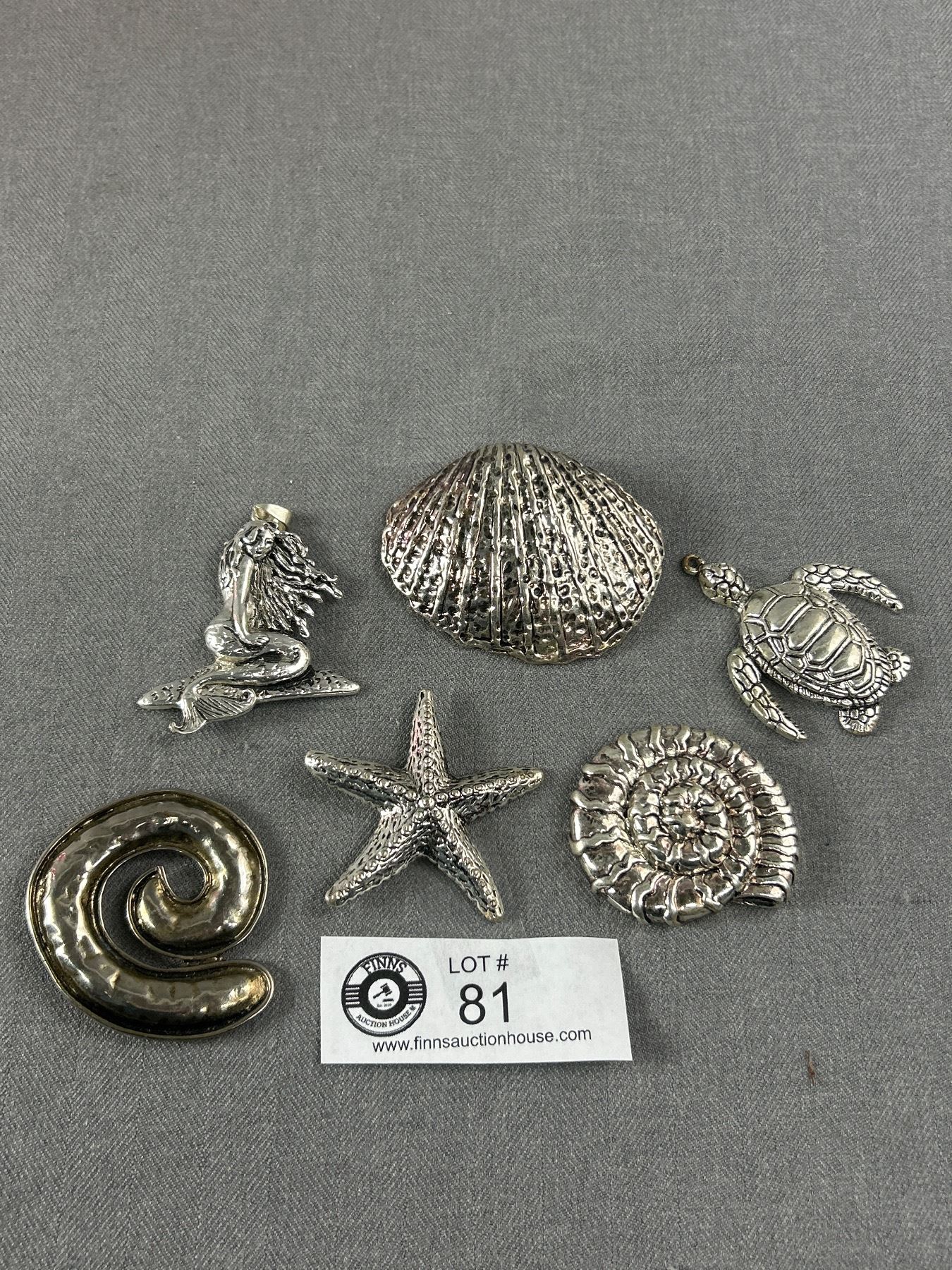 5 Silvertone Ocean Themed Large Pendants & 1 Silvertone Swirl Brooch