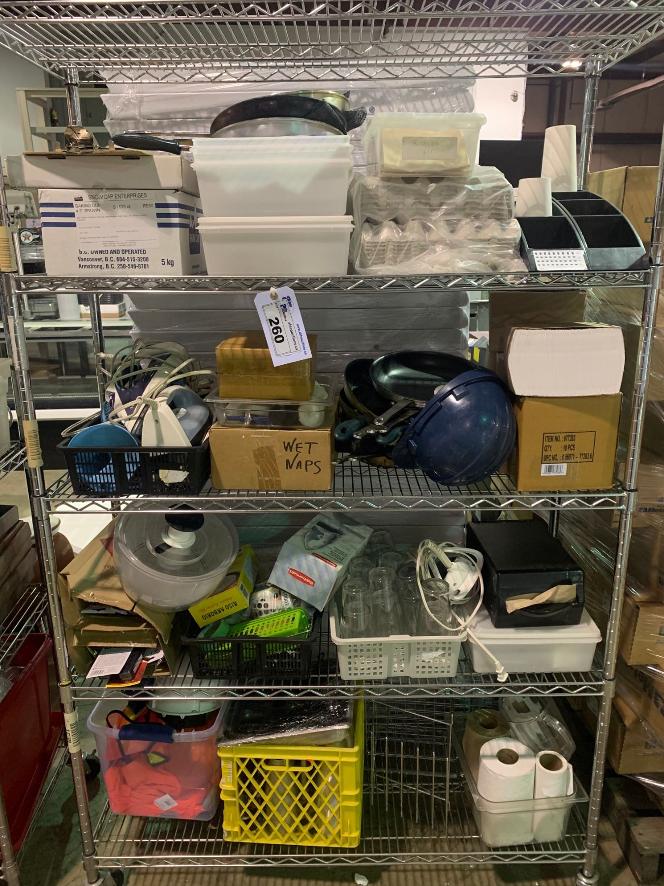 5 TIER MOBILE METRO RACK WITH ASSORTED PANS, PRODUCT & GLASSWARE ( RACK INCLUDED )