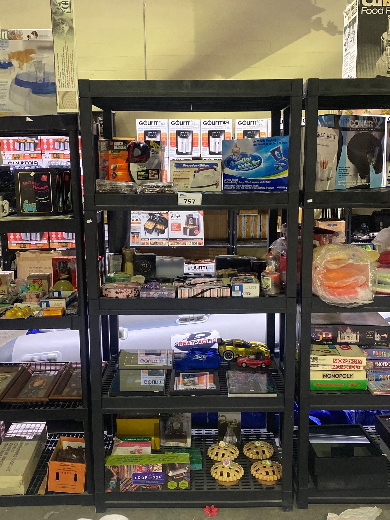 5 TIER SHELVING UNIT WITH CONTENTS: MR. CLEAN AUTO DRY, BLACK & DECKER PALM SANDER, PROCTOR IRON, ASSORTED TOILETRIES, & MORE