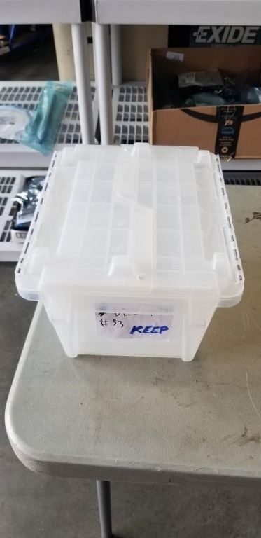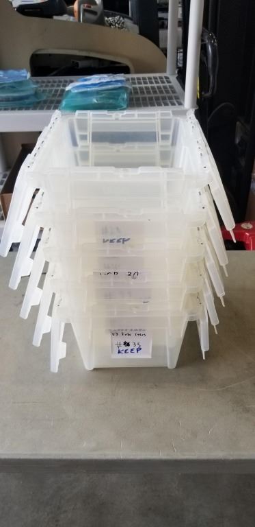 5 ULINE PLASTIC TOTES WITH ATTACHED LID, GOOD CONDITION, NO CRACKS
