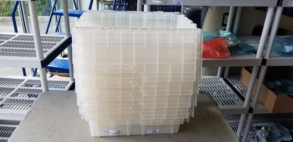 5 ULINE PLASTIC TOTES WITH ATTACHED LID, GOOD CONDITION, NO CRACKS