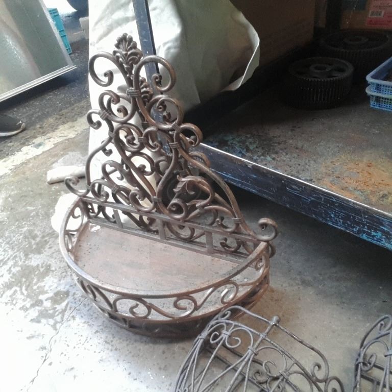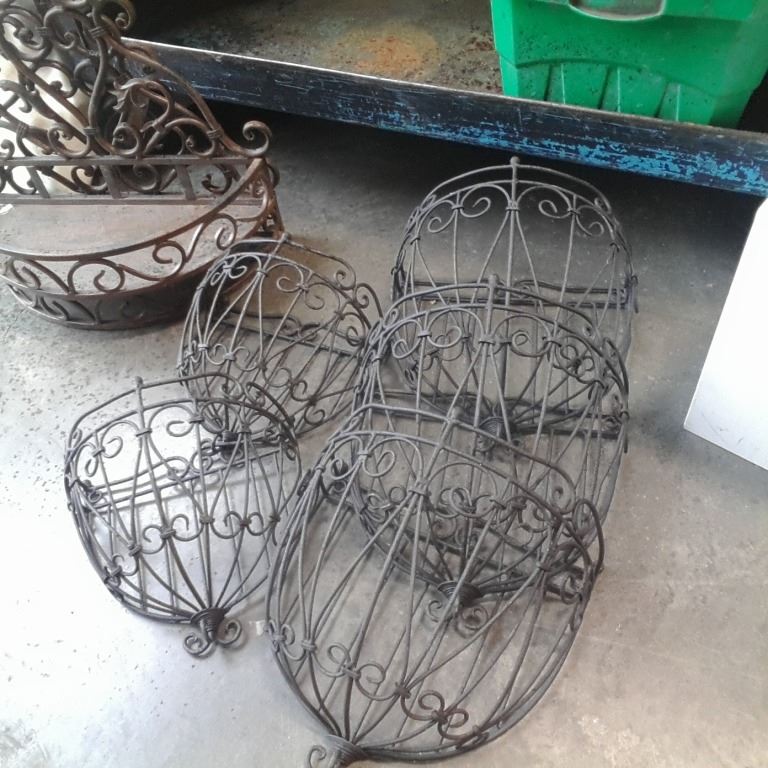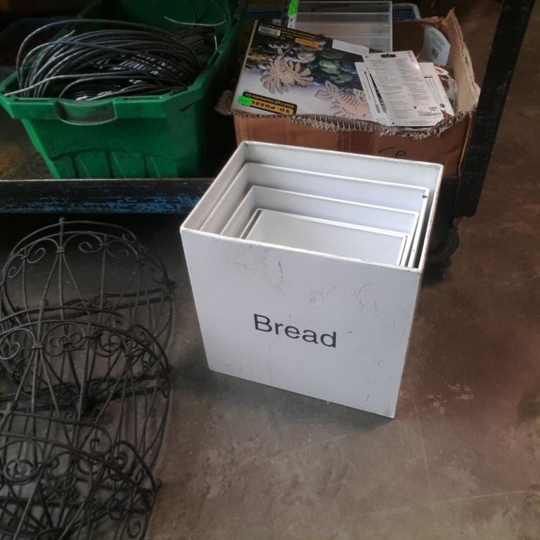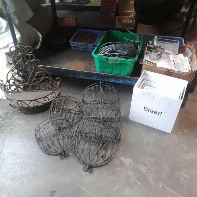 5 WALL PLANTERS, 2 METAL SHELVES AND METAL BREAD TINS