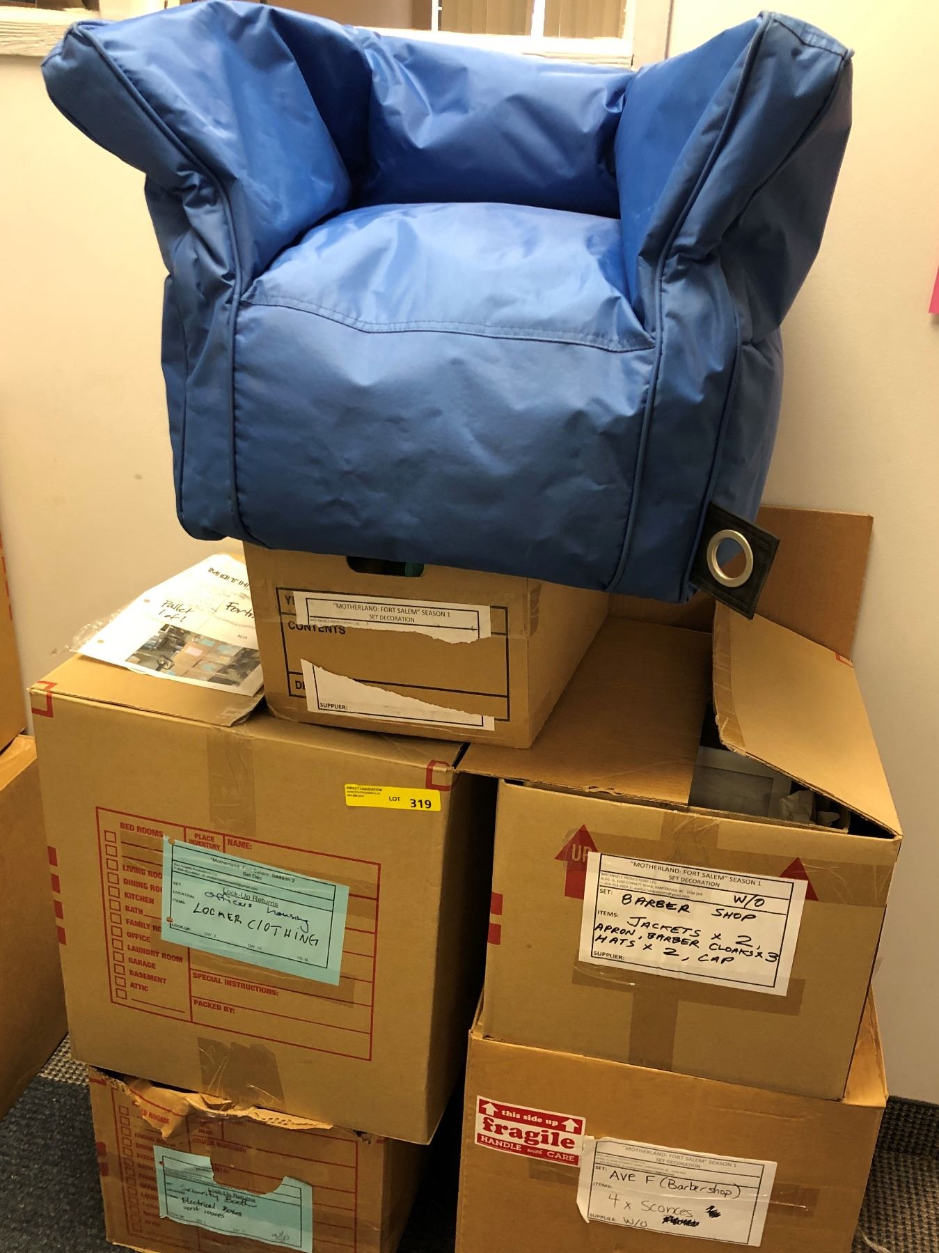5 boxes of misc items - sconces, jackets & Cloacks, Locker Clothing, and small kids beanbag chair