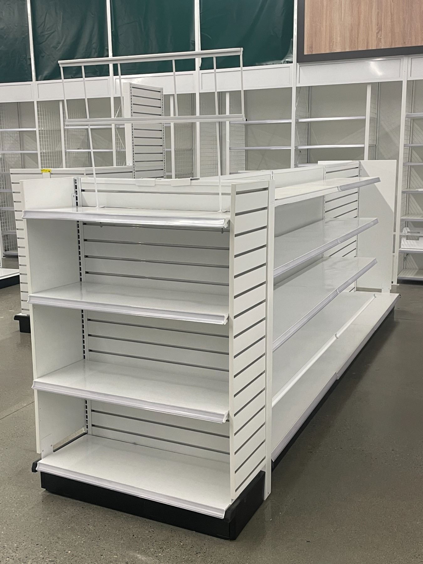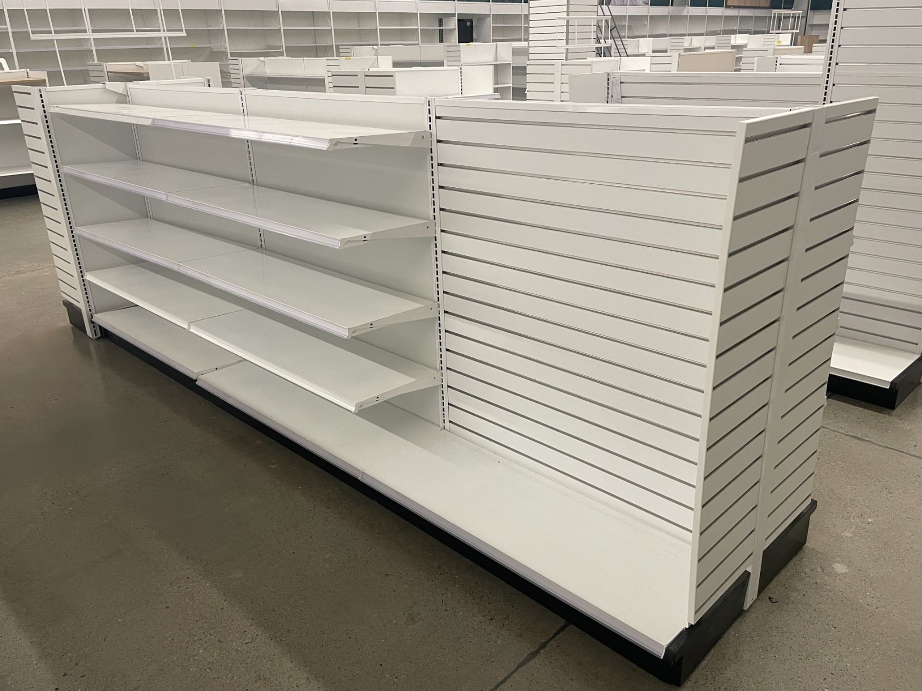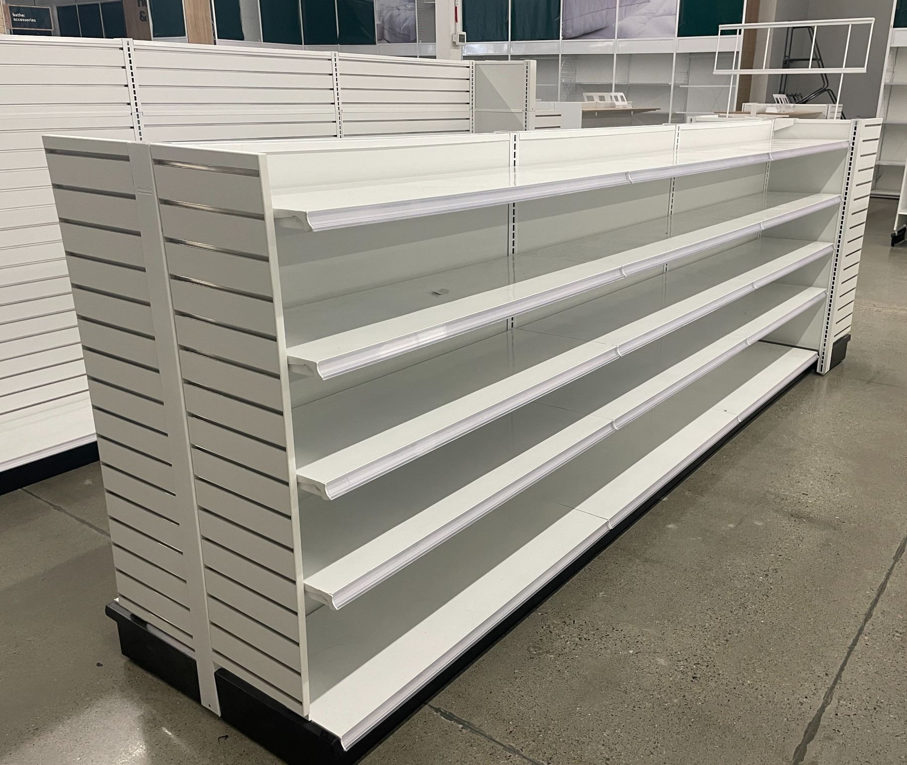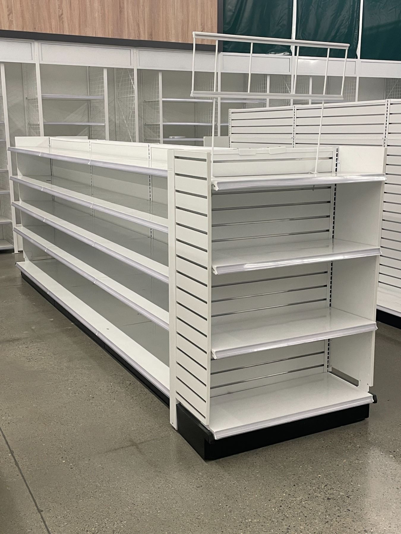 5 tier retail shelving double-sided gondola with single end cap (approx. 163in W 55in H (73in w/sign holder) 38in D - excellent condition - Madix brand) BIDDERS ARE RESPONSIBLE FOR ALL COSTS ASSOCIATED WITH PICKUP OF THEIR LOTS INCLUDING BUT NOT LIMITED TO RENTAL OF EQUIPMENT, FORKLIFTS, LABOUR, TRUCKING, TOOLS ETC.