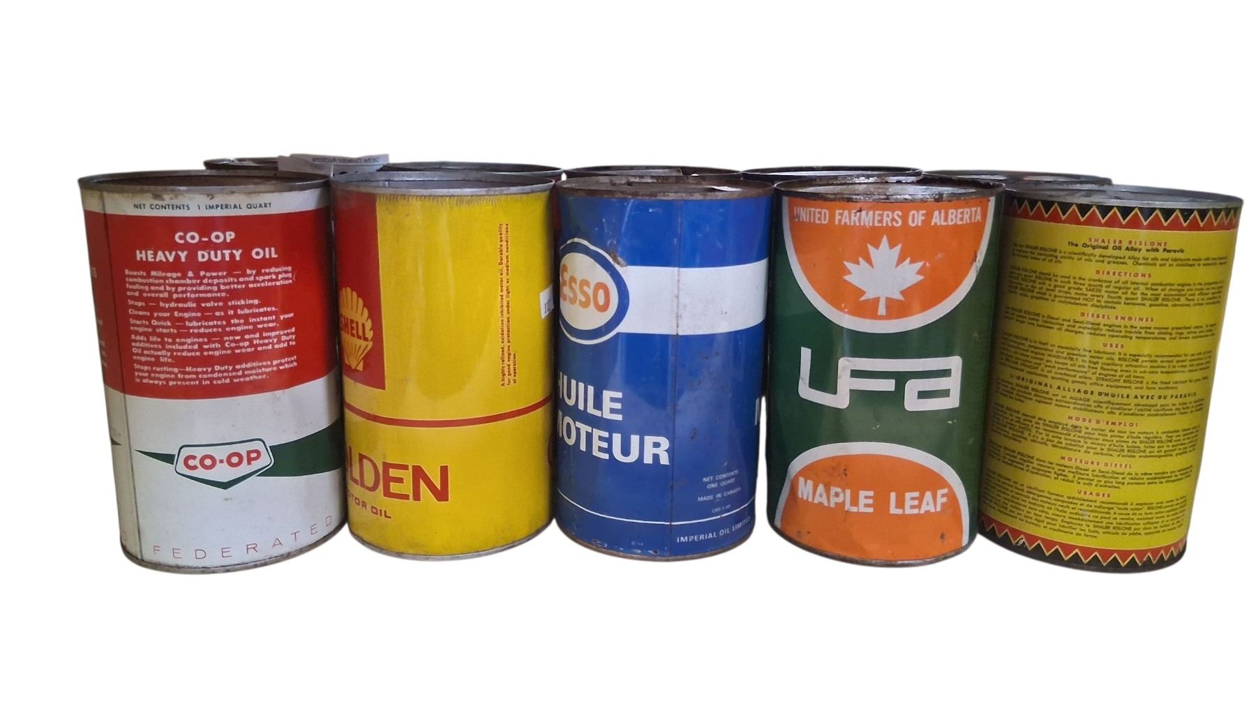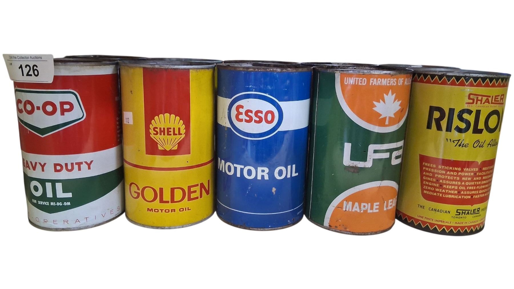 5 vintage oil tins, Co-op, Shell, Esso, LFA, Rislone