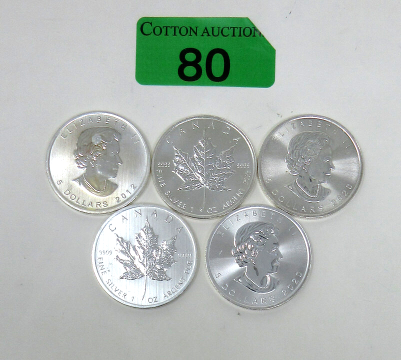 5 x 1 Oz .9999 Silver 2012 Maple Leaf Coins