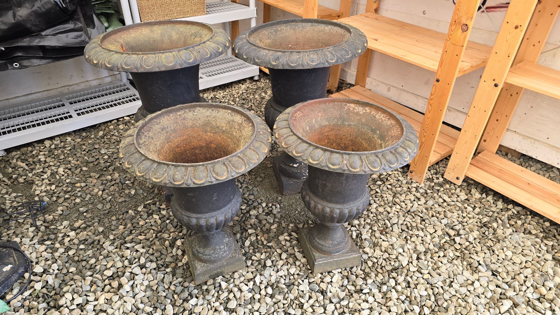 2 LARGE AND 2 XL ANTIQUE CAST IRON URN PLANTERS.