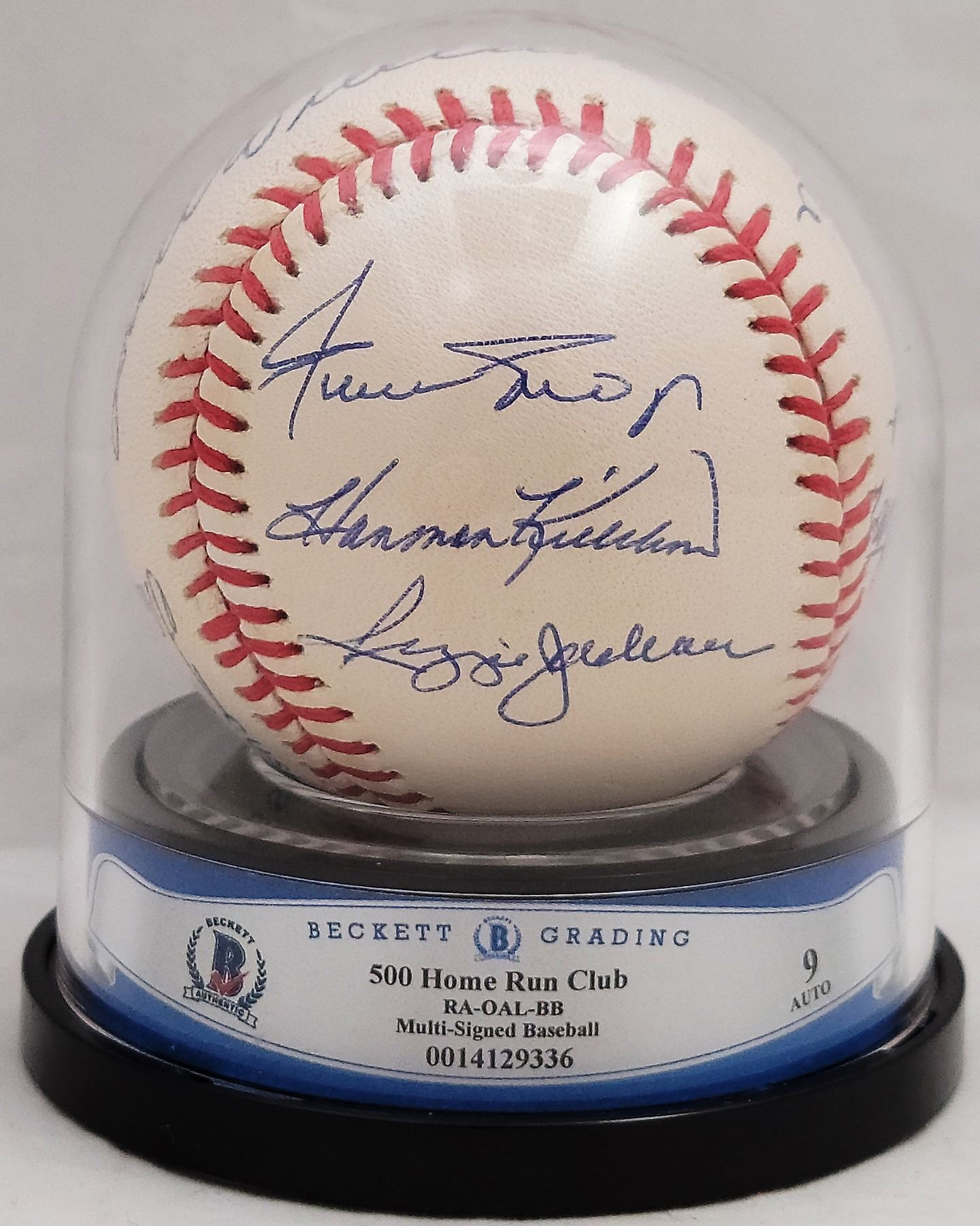 This is an Official American League Baseball that has been hand signed by 11 members of the 500 Home Run Club. This baseball was signed by Mickey Mantle, Ted Williams, Willie Mays, Hank Aaron, Mike Schmidt, Ernie Banks, Willie McCovey, Reggie Jackson, Eddie Mathews, Harmon Killebrew & Frank Robinson. The condition of the signature was graded a Mint 9 by Beckett BAS. This item has been certified authentic by Beckett Authentication (BAS) and comes encapsulated in their tamper-proof baseball holder.