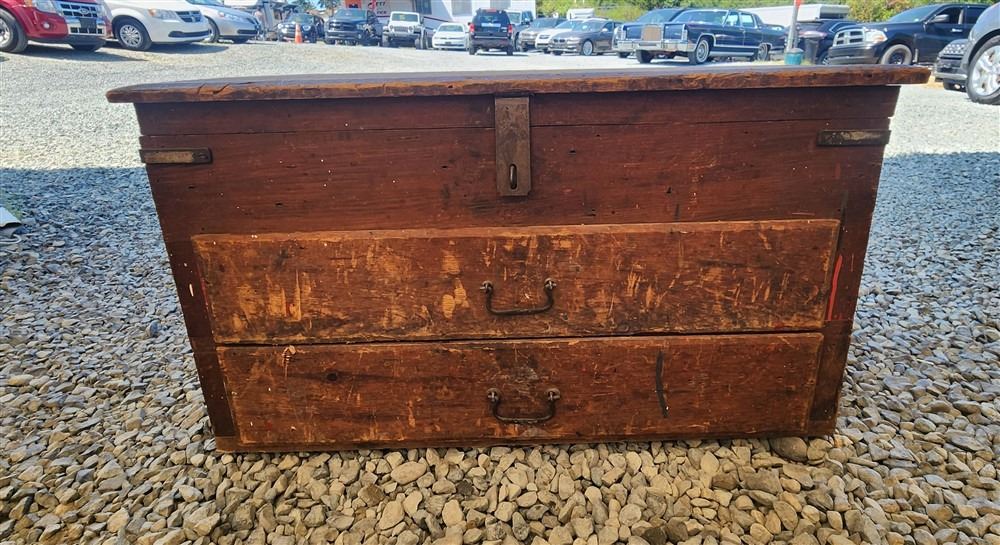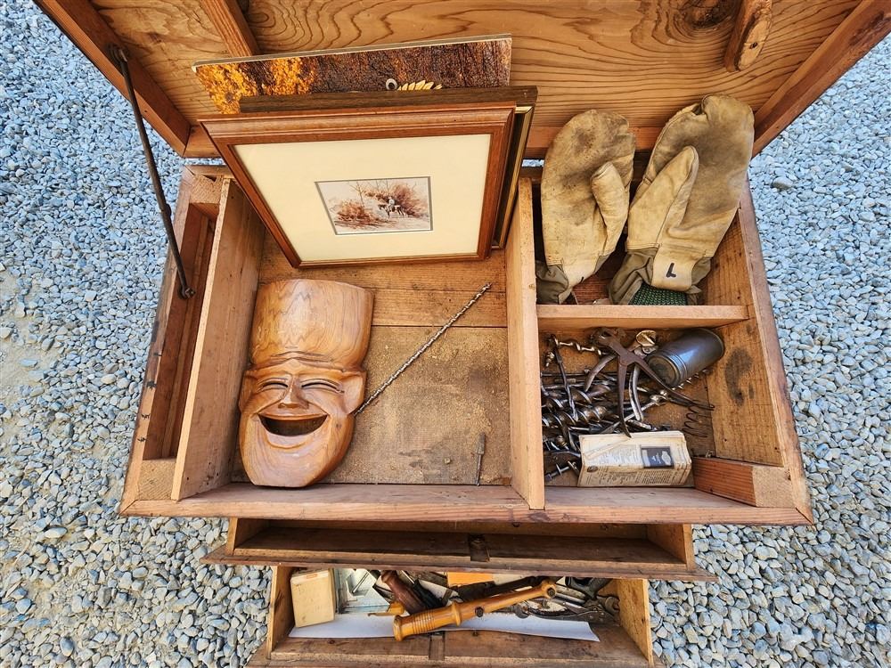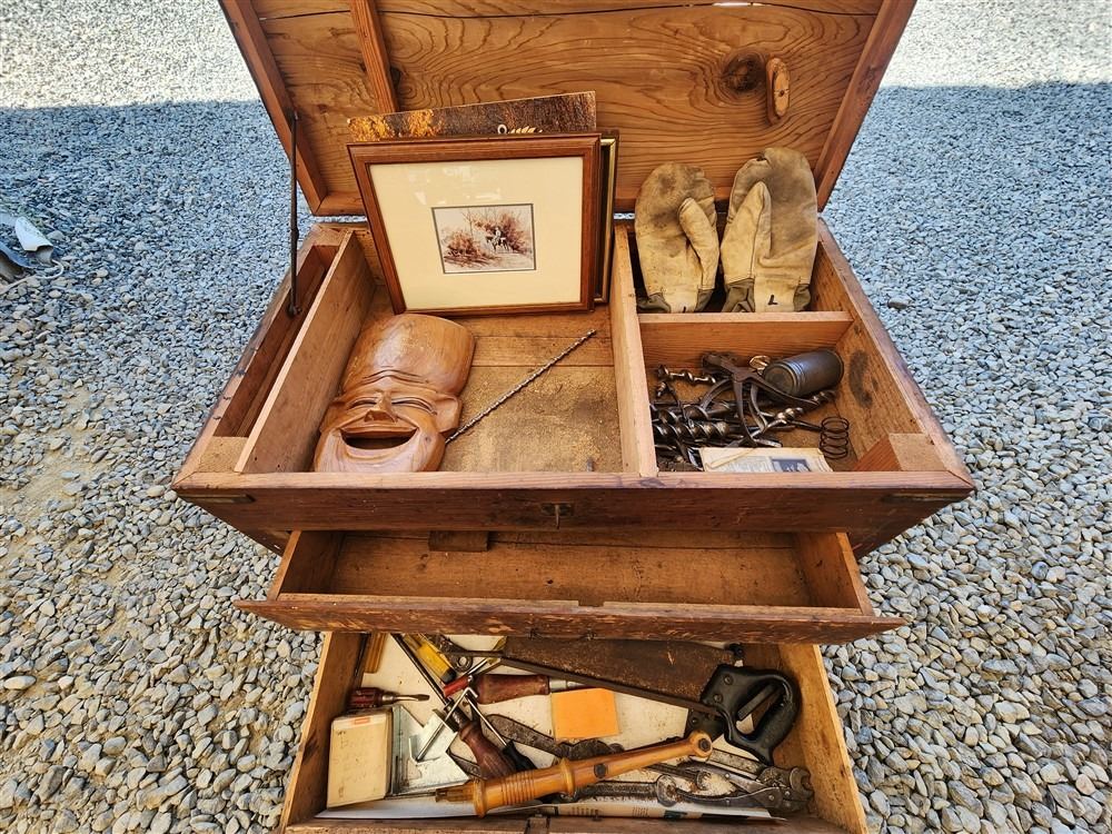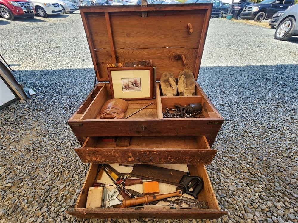 WOOD CHEST WITH RANDOM TOOLS AND ARTWORK